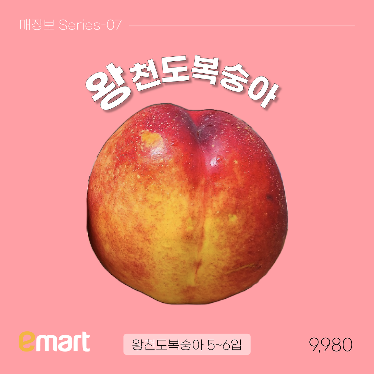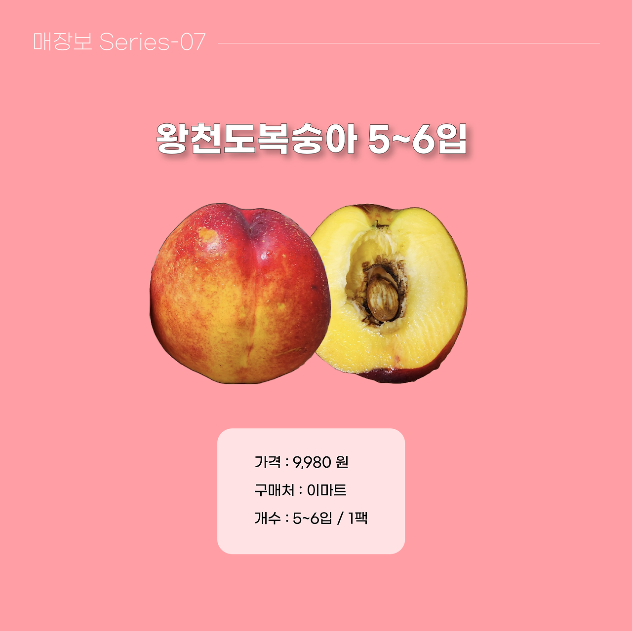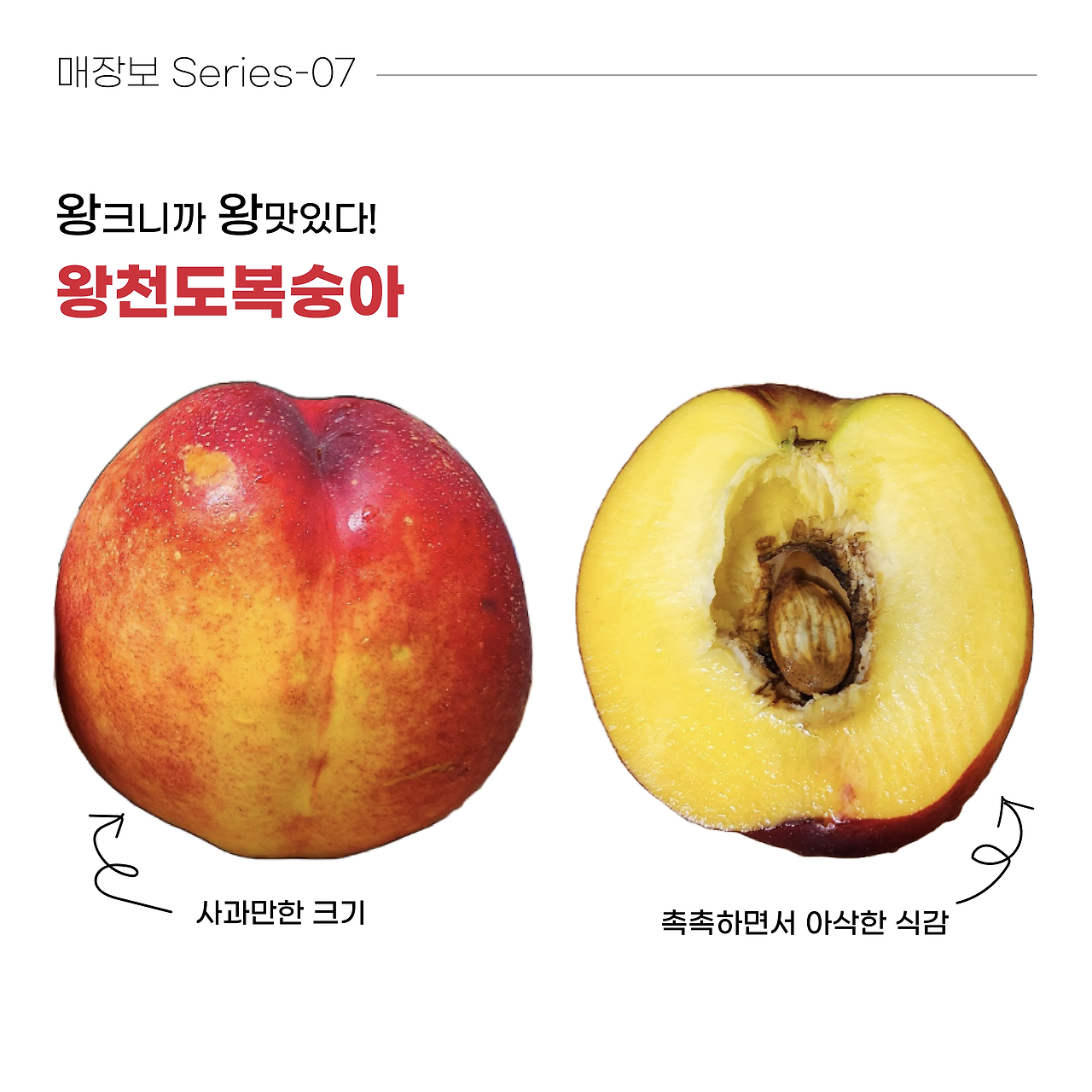 7-8월에는 복숭아가 제철이죠. 올여름 첫 복숭아를 사기 위해 마트 과일 코너를 기웃거리다가. 재미난 품종을 발견했습니다. 이름하야 '왕천도복숭아'. 이름에 걸맞게 크기는 엄청나게 커다랗지만, 빛깔은 천도복숭아와 똑같습니다. 커진 크기만큼이나 더 달콤하고 상큼할 것만 같은 느낌이 들어 바로 구매했습니다.