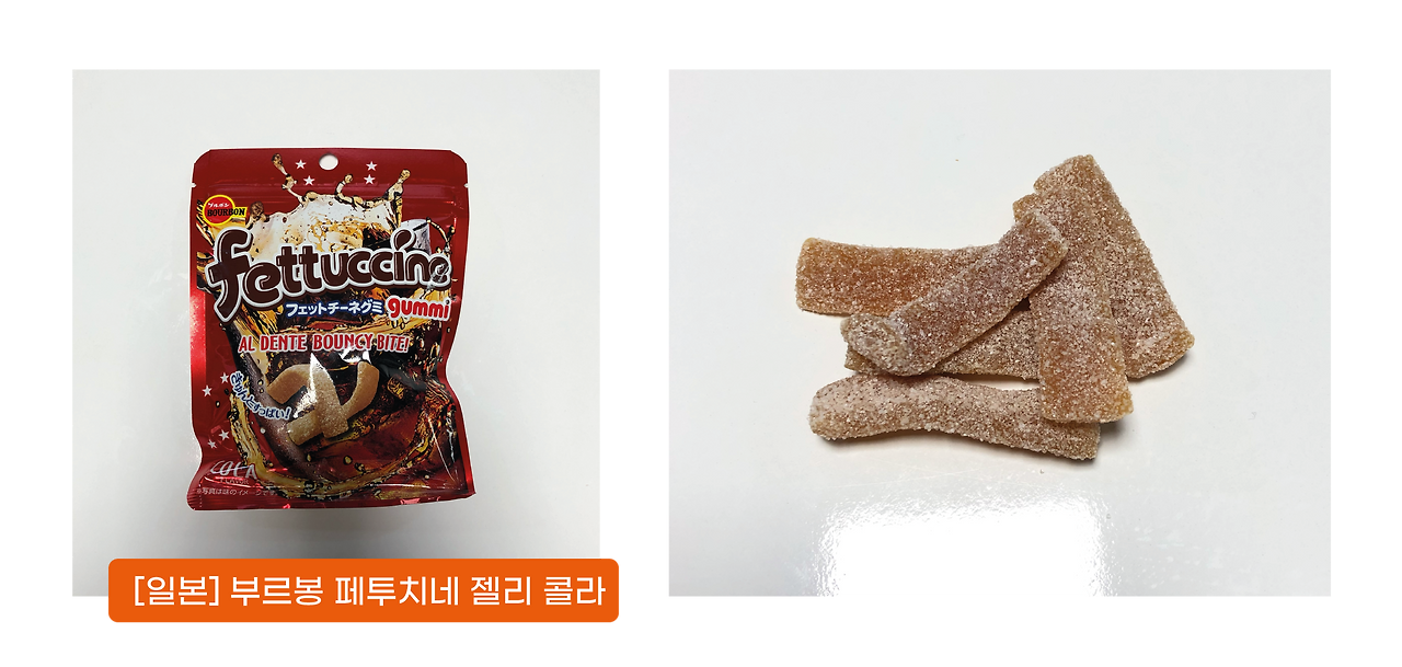 다른 젤리와는 조금 다른 식감이에요, 꼬들꼬들한 식감입니다. 면 가운데 심지가 남을 정도로 설익힌 ‘알덴테’ 상태의 파스타 면 식감을 재현했다고 하는데요, 그래서 그런지 쫀득하면서도 힘이 있는 질감이에요. 콜라향도 진하고, 신맛도 다소 강한 편입니다. 짜릿짜릿한 맛이랄까요. 독특한 식감과 강한 맛이 잘 어울려, 자주 구매하는 젤리 중 하나입니다. 사우어 젤리 마니아분들은 꼭 드셔보세요!