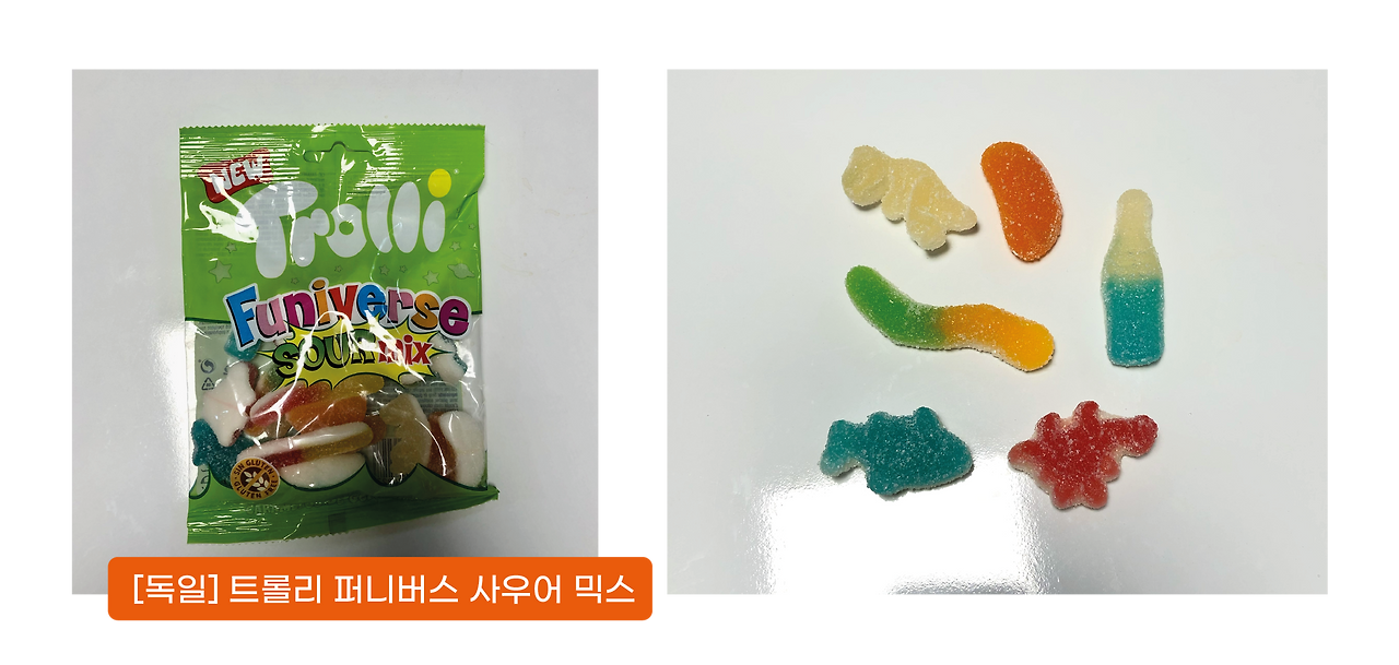 트롤리는 1975년 설립된 독일의 제과 회사입니다. 다양한 맛과 식감의 젤리를 생산하여 전 세계 80개국에 수출하고 있습니다. 대표적인 상품으로는 지구 젤리가 있습니다 몇 년 전 한국에서도 크게 유행했었죠. 퍼니버스 사우어 믹스는 공룡, 귤 물고기 등 다양한 모양의 사우어 젤리가 담겨있는 제품입니다. 독일의 브랜드이지만, 이 제품의 원산지는 스페인이네요.