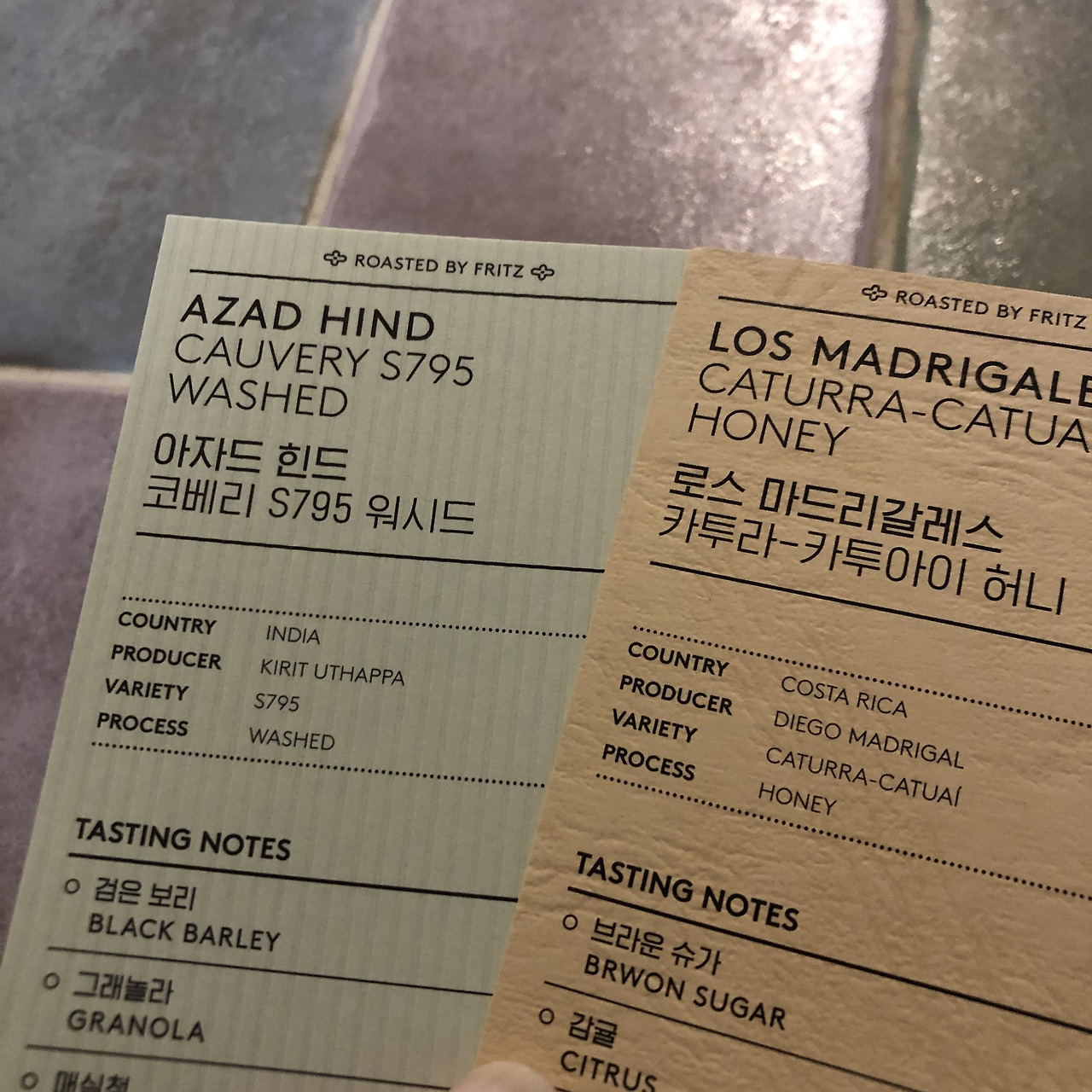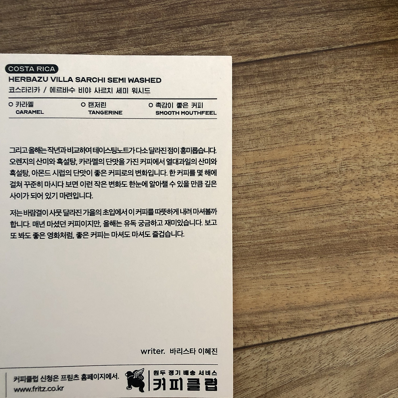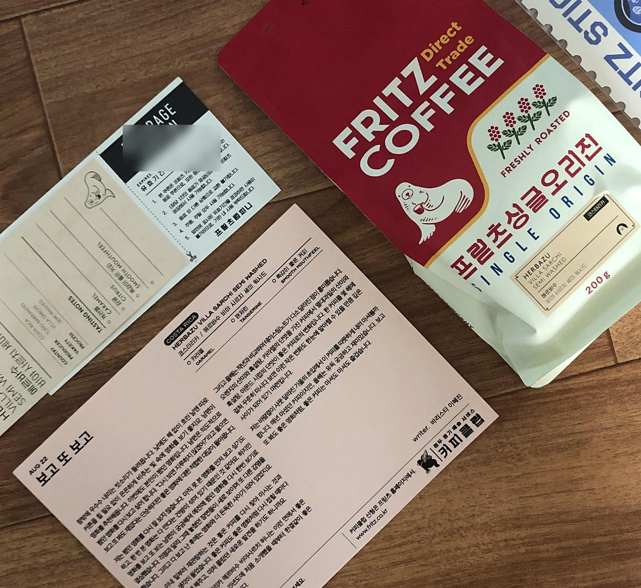 한 장은 테이스팅 노트, 한 장은 바리스타의 편지인데요, 이 편지엔 프릳츠의 바리스타들이 해당 원두에 대해 직접 쓴 글이 적혀있습니다. 원두 산지의 이야기, 바리스타의 감상 등이 적혀있는 이 글은 커피만큼이나 기대되는 구성품이었습니다.
