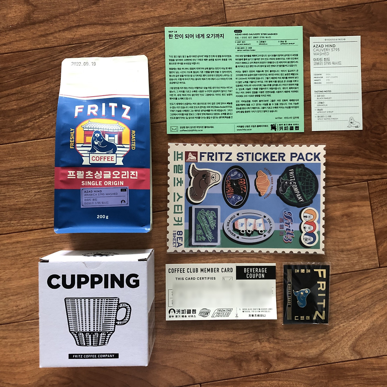 첫째 주에는 가입 선물이 함께 배송됩니다. 덕분에 가장 설레고 기다려지는 회차예요. 프릳츠는 커피뿐만 아니라 감각 있는 디자인의 굿즈로도 유명하거든요, 이 굿즈를 선물로 받아 볼 수 있다는 것은 정말 큰 행복이죠. 사진은 3개월 구독 시에 증정되는 선물입니다. 음료 쿠폰, 커핑컵, 배지, 스티커까지, 정말 푸짐하죠? 단순한 로고 플레이가 아닌 프릳츠의 ‘코리안 레트로’ 감성이 제대로 담긴 굿즈라 더욱 인상 깊습니다.