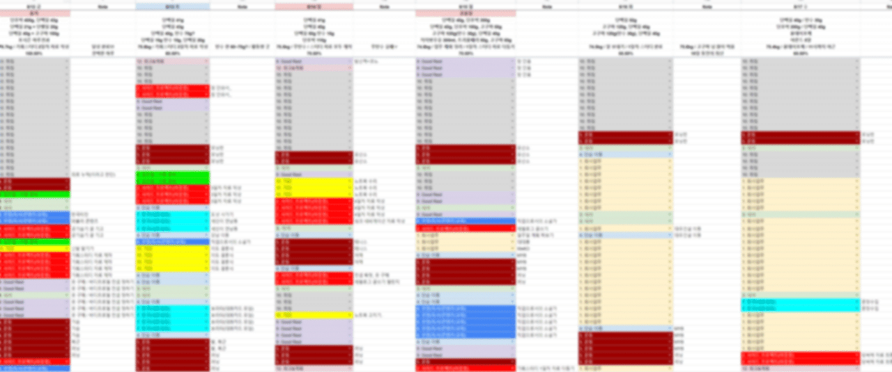 역대급으로 정신없던 7월이 지나갔다. 바빴던 만큼 시간을 잘 활용해야 했다. 바디 프로필을 찍기 위해선 체지방을 10% 이하로 줄여야 했는데, 나름의 계산을 해보니 하루에 유산소 1시간 이상, 그리고 웨이트도 1시간 이상 매주 6회 이상 진행해야 했다.(7월 안일함의 폐해였다.) 어쩌겠는가.. 해야지. 그러기 위해 시간도 최대한 압축적으로 쓰려고 했는데, 압축적으로 쓰기 위해선 계획한 시간에 그것을 무조건 해야 했다. 퍼블리에서 구글 스프레드로 시간 기록 및 관리를 하는 것을 보고 해당 양식을 활용해서 시간을 카테고리로 나누고 30분 단위로 기록하고 계획했다. 휴식 시간도 관리하며 시간을 보냈다. 1달 동안 보내는 시간의 단위를 관리하니 한눈에 투여해야 하는 시간을 확인할 수 있었고, 계획할 수 있어 좋았다. 계획이 수단이 되는 것 같아 지금은 이렇게까지 관리하지 않지만, 이때 기록했던 습관이 남아 휴식 시간을 더 소중히 쓸 수 있게 되었다. (템플릿이 궁금하다면 퍼블리에서 구글 스프레드 시간 관리법을 치면 나온다.)