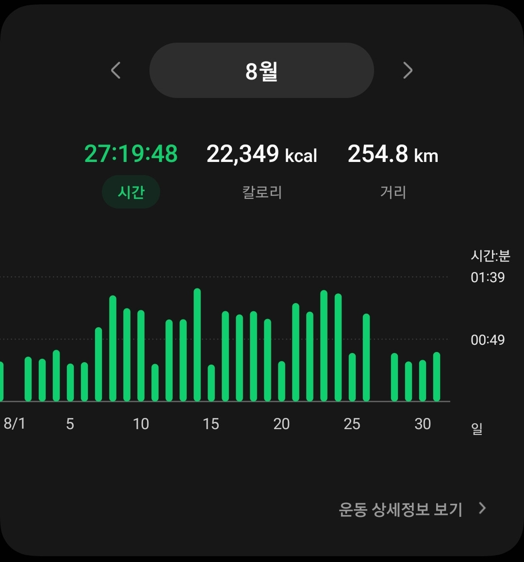 위처럼 시간 관리를 한 덕에 야근을 하며 운동을 함께 병행할 수 있었고, 8월에만 총 254.8km를 달릴 수 있었다. 1달 동안 매일 8.5km를 달린 수치였다. 스스로 불러온 재앙이지만 이렇게 달리지 않으면 바디 프로필을 찍을 수 조차 없을 것 같았고, 그러는 것은 1달 동안 254km를 달리는 것보다 싫었었다. 아무튼 달리고 이때부터는 고구마, 샐러드, 단호박 위주의 식단도 병행했다. 힘이 없어서 뛸 수 없다는 생경한 느낌도 경험했는데 다음에 바디 프로필을 하더라도 건강하게 하겠노라고 다시 한번 다짐했다.