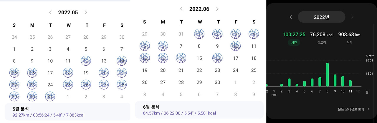 올해 다짐했던 "체력 관리"를 하기 위해 가장 지속했던 것은 달리기였다. 달리기는 집 근처에서 준비 없이 할 수 있는 가장 완벽한 운동이었고, 나의 체력을 길러주는 소중한 방법이었다. 예전에 사용했던 RunDay와 지금 사용하는 삼성 헬스의 달리기 기록을 합쳐보았다. 총 1,060.47km를 달렸었다. 만약 내가 1,000km를 목표로 달렸다면 달리지 못했겠지만, 중간 바디 프로필을 하며 달릴 수밖에 없던 환경을 만드니 자연스레 달성한 느낌이었다.(실제로 8월에 220km를 달렸으니 말이다.)