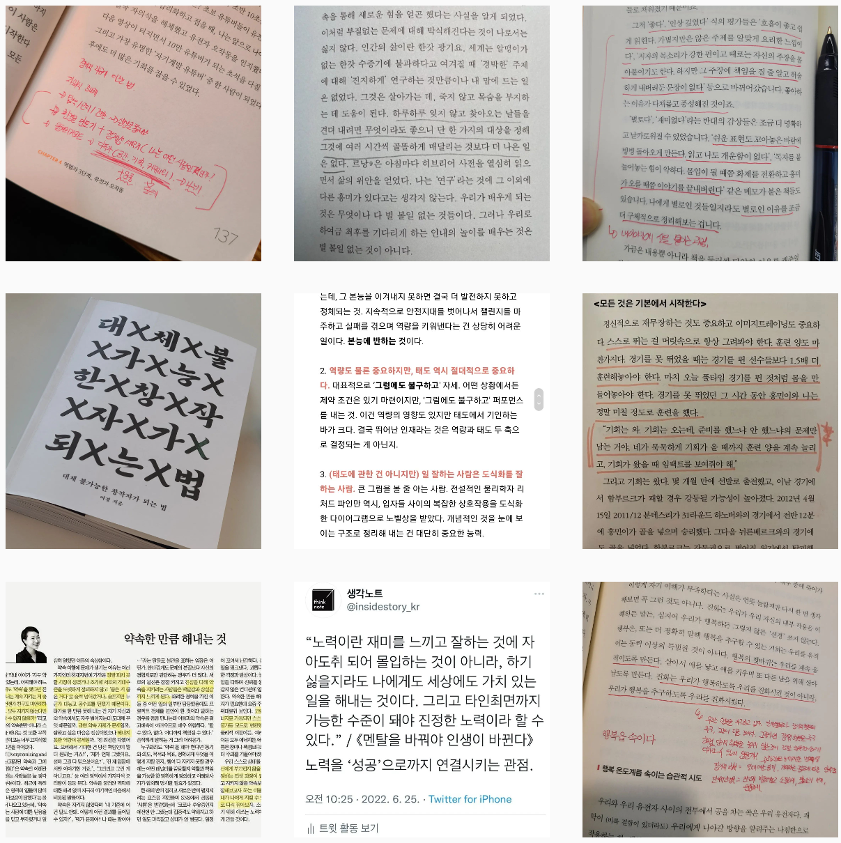 올해의 목표 중 하나는 매력적인 공간을 100군데 이상 돌아다녀보기였다. 취향이 깃든 공간을 만들고 나만의 감각을 키우려면 많은 공간을 다니고, 나만의 취향을 모아야 했다. 주말에 집에만 있는 것을 선호하지 않는 편이기도 했어서 나돌아 다니는 것은 혼자서도 나름 재밌었다. 공간을 다니며 공간에서 느낀 감정들을 기록하기 시작했다. 혼자 결심해서 꾸준히 글을 쓸 의지력이 되지 않기에 나에게 미션을 주어 지속 가능할 수 있게 글을 쓸 수 있는 커뮤니티를 활용했다. 1달에 1번 공간 기록을 남기는 커뮤니티에 들어가거나 공간 인사이트를 나누는 오픈 채팅방에 들어가기도 했다. 덕분에 1달에 1번 이상은 나만의 관점을 기록할 수 있었고, 지금까지 그 습관을 잘 이어가고 있다. 글감들은 별도로 모아 두고 퇴고를 거쳐서 업로드했다. 긴 호흡으로 정제한 기록을 모아두는 공간도 브런치로 통합해야지. 1달 동안 매일 영감을 기록하기도 했었는데, 이 과정에서 글 쓰는 것에 대한 막연함을 덜 수 있었다. 이것도 역시 챌린지 커뮤니티에 들어가서 미션을 진행하듯 올렸는데, 2일 빼고 모두 업로드에 성공했다. 역시 미션을 설정해놔야 조금이라도 하는 나의 성향을 한번 더 확인했다.