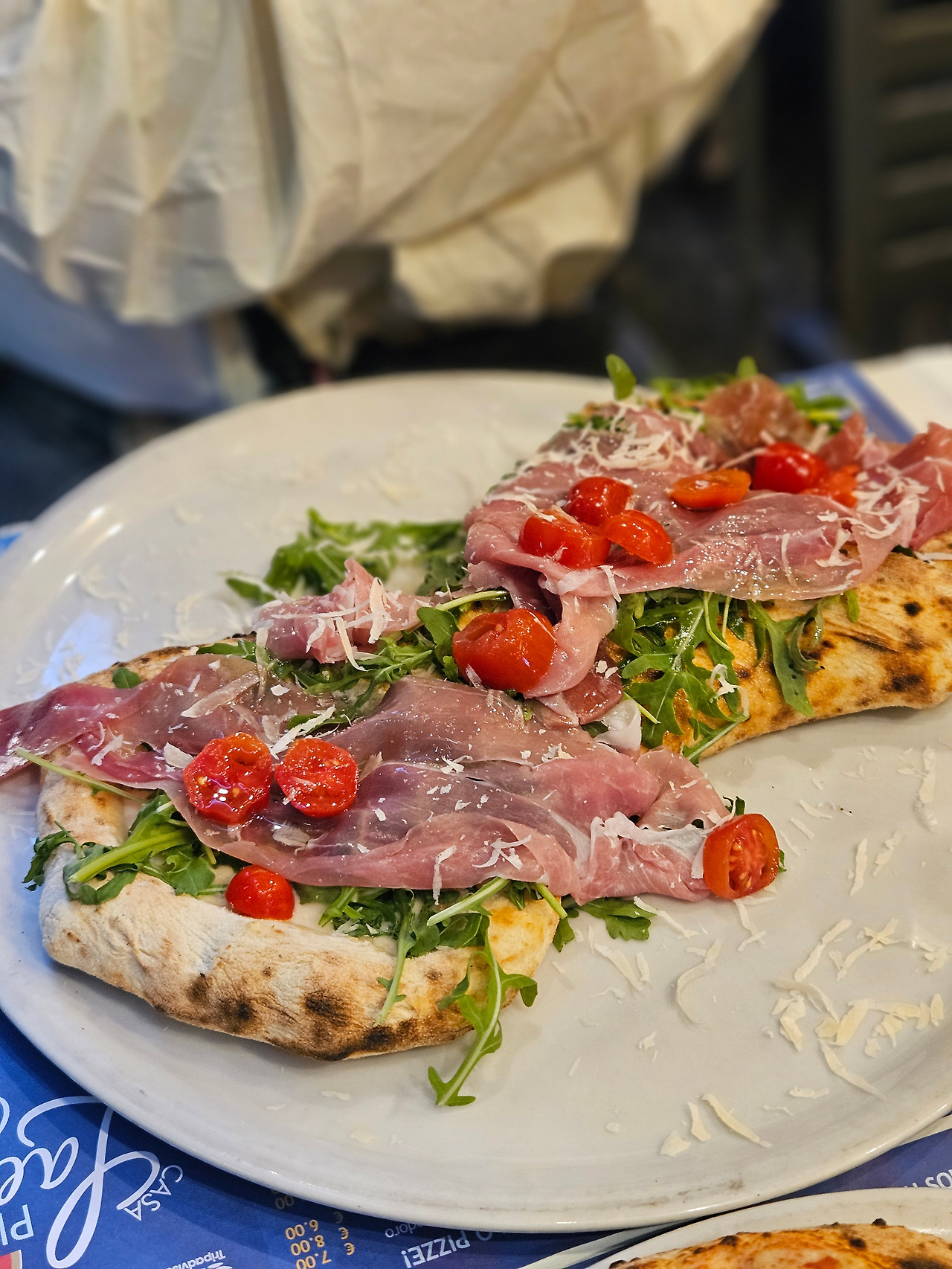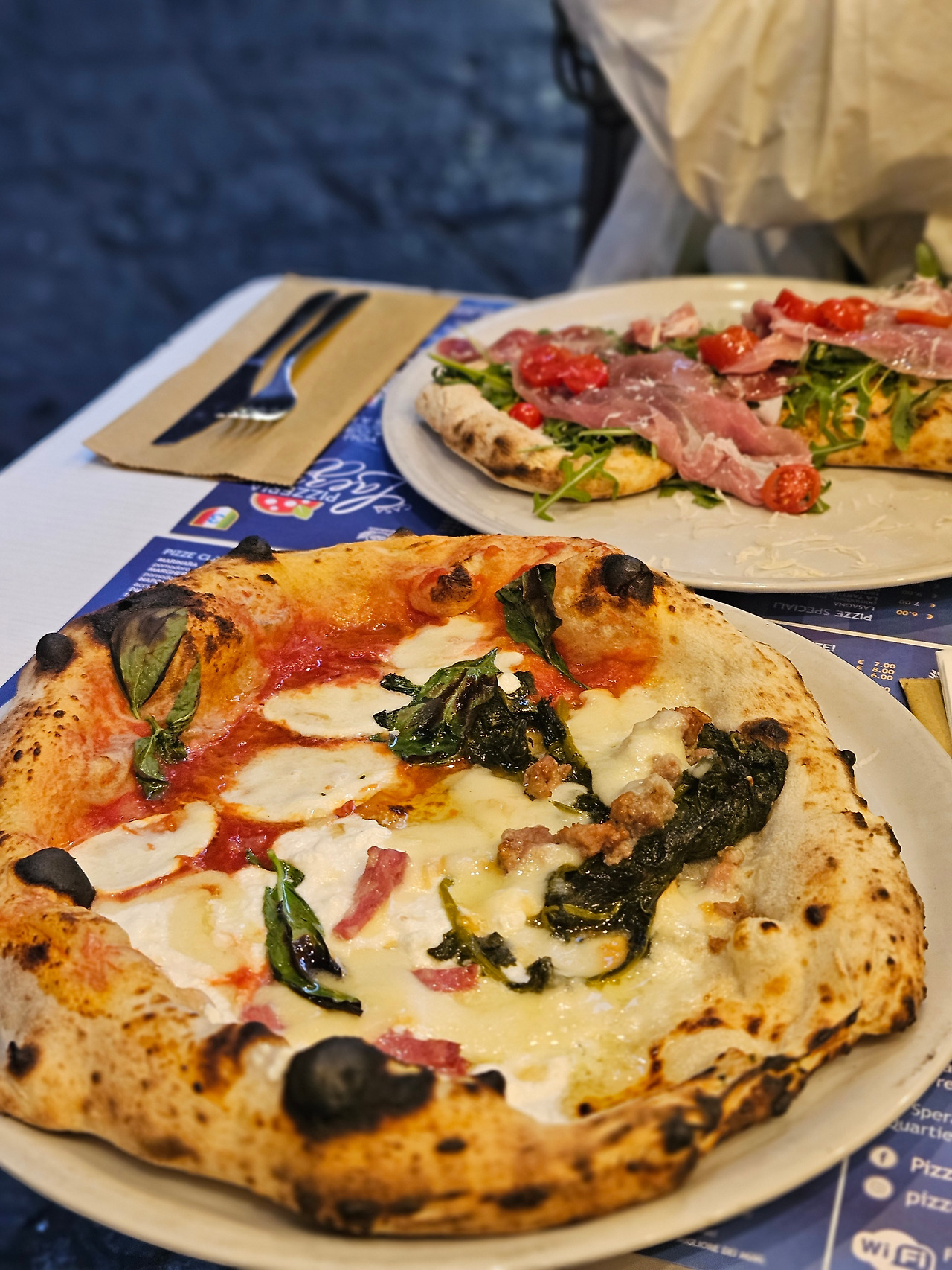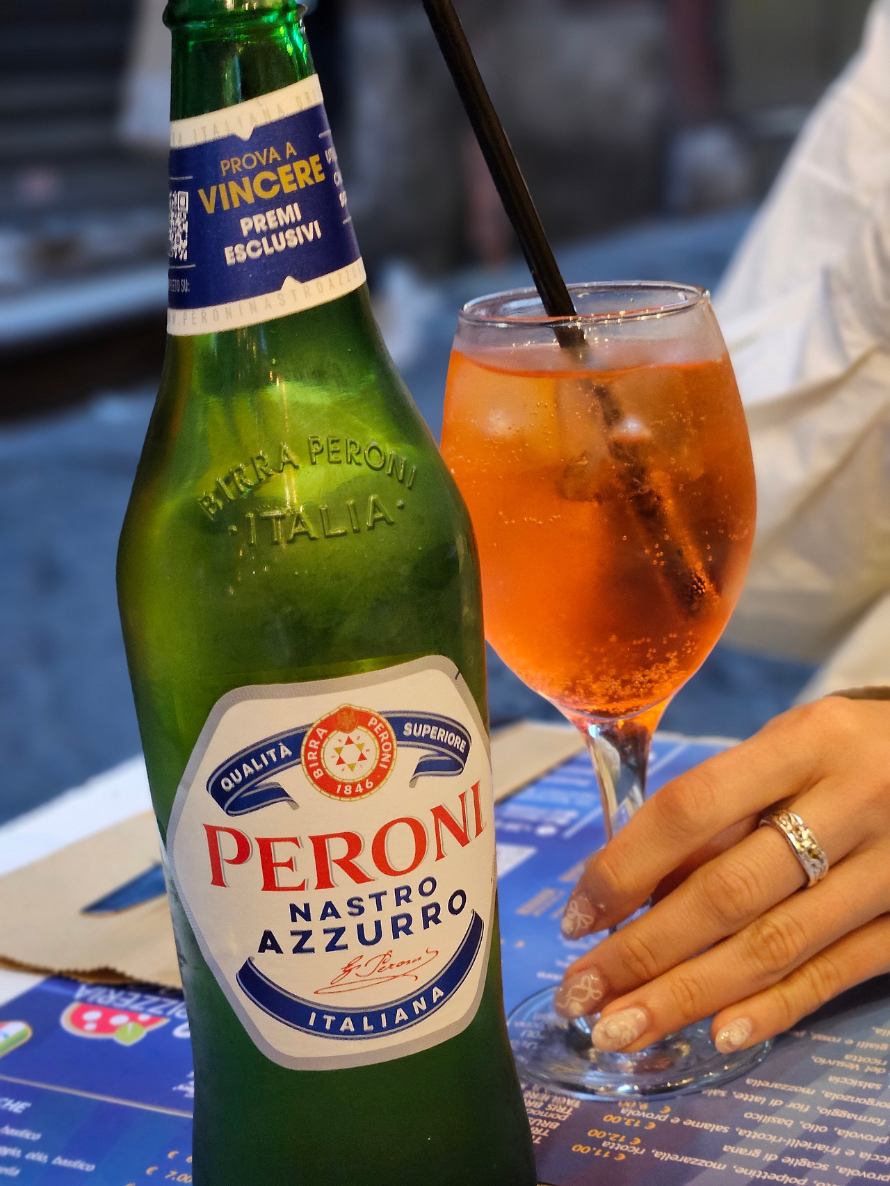 나는 4가지 토핑이 올라간 피자와 이탈리아 대표 맥주인 페로니 맥주를, 아내는 도우 위에 루꼴라와 프로슈토, 그리고 토마토가 올라간 피자 그리고 이탈리아 대표 칵테일 아츠로를 시켰다. 미리 받은 맥주와 칵테일을 홀짝이니 이내 큰 접시 위에 피자를 내어주었다. 피자를 칼로 잘라 한 조각 입으로 넣었을 때 나는 나폴리와의 인연이 악연이 아닐 것임을 확신했다. 이탈리아 피자의 진가를 맛보려면 나폴리에 가라고 했던가. 한국 피자는 3조각 까지가 맥시멈인 나도 한 판을 다 먹을 수 있을 정도로 부담스럽지 않게 맛있는 맛이었다. 이후에 알고 보니 미국식 도우는 기름진데 반해 이탈리아 피자는 바삭하고 담백한 것이 특징이라고 한다.