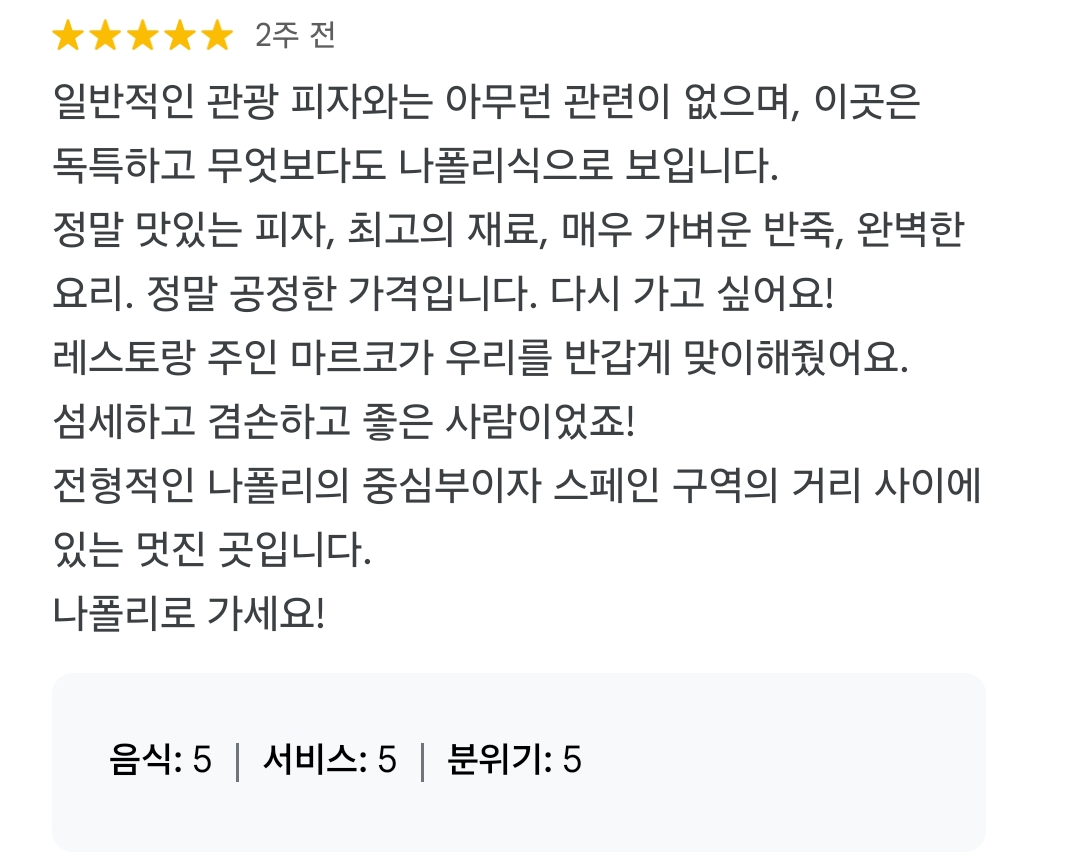 좋지 않은 첫인상이 기우일 거라고 다짐하며, 숙소 근처의 피잣집을 향했다. 구글 지도에서 맛집을 찾아보니 대부분의 식당들이 4점 이상대의 평점을 기록하고 있었다. 나폴리에 왔으니 제대로 된 나폴리식 피자를 먹어보자고 다짐하며 스캔한 결과, 한 피자집의 리뷰가 눈에 차였다. '일반적인 관광 피자와는 관련이 없는 나폴리식 피자'라는 리뷰에 고민하지 않고 가게로 향했다. 그곳은 약 2900명의 전 세계인이 평균 4.5로 평가한 곳, Pizzeria Laezza라는 곳이었다.