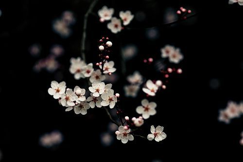젖은 검은 나뭇가지 위 꽃잎들