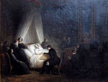 이제 곧 닥칠 죽음 직전 죽어가는 이가 누워있는 방안은 고요와 적막이 내려앉았다. 마치 폭풍전야 같은 분위기에서 눈가에 마른 눈물을 붙인 채 지인들은 숨죽이며 마지막 순간을 기다리고 있다. 영국 빅토리아 조풍의 청교도 문화에서는 관례적으로 누군가 죽음을 맞을 때 가족 친지가 모여 죽음의 순간을 지켜준다고 한다. 단순히 한 인간의 죽음이 아니라, 그들에게 죽음은 시에서 표현되듯 “왕”(신)의 왕림이기 때문에 죽는 이와 함께 그 순간을 목격하고 맞이하기 위해서 목소리도 낮추고 경건하게 밤을 새운다.