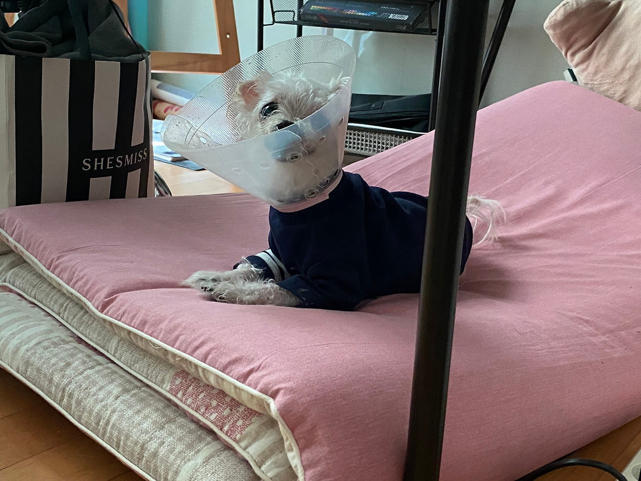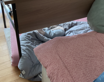 동생을 따라 들어간 방은 여느 때와 달라진 점이 없어 보였다. 동생이 쪼그리고 앉아 책상 밑을 가리켰다. 책상 밑에는 부모님이 오시면 꺼내는 이불을 개어두었는데, 입구 쪽에서 보면 바닥에 놓인 이불더미의 끝자락이 책상 하부의 가림막과 맞닿아있어, 마치 이불더미와 책상이 연결된 것처럼 보인다. 다솜이는 바로 그 이불더미 위에 있었다. 정확히 말하면 자고 있었다. 코까지 골며.