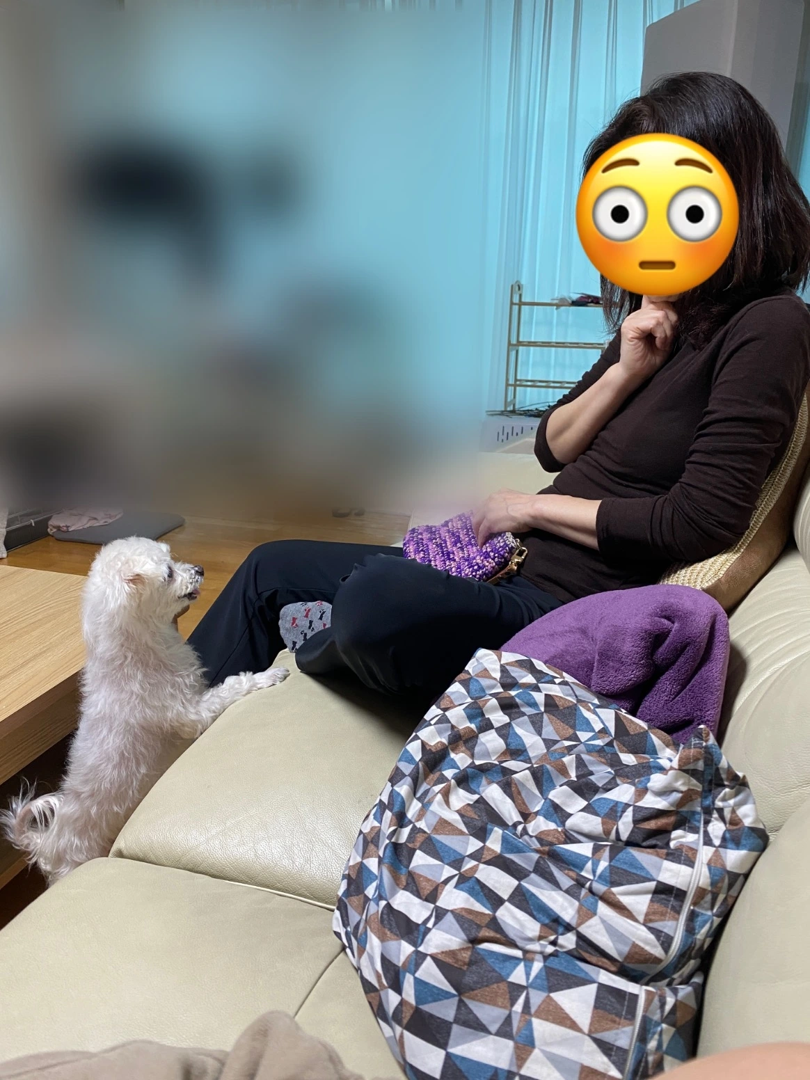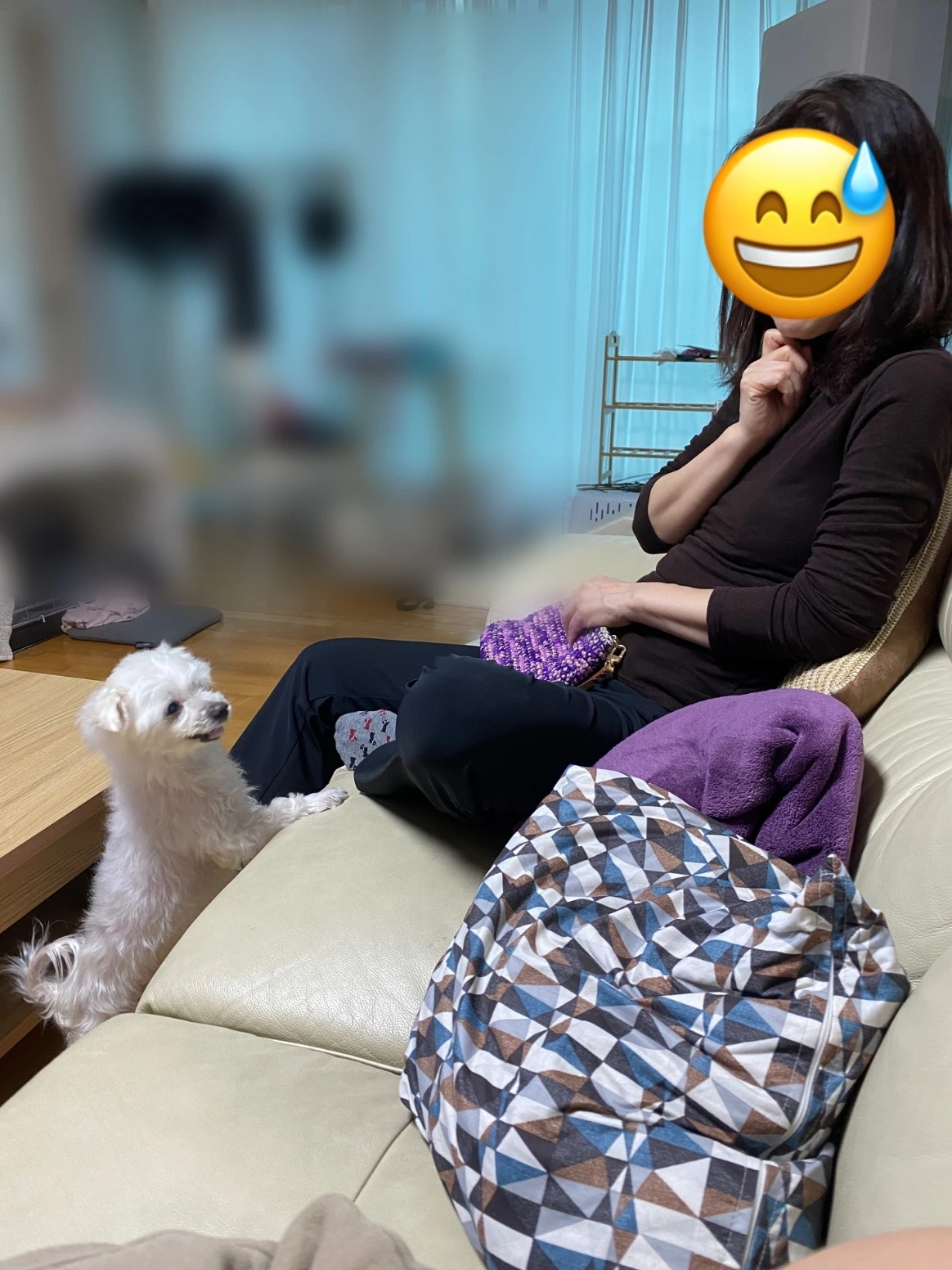 그런데 엄마를 처음 만난 이 날은 조금 달랐다. 다솜이는 멀찌감치 서서 엄마를 쳐다보더니 천천히 엄마가 집 안에 들어오는 것을 지켜보았다. 마치 누나들과 한가족이라는 것을 알아차리고, 엄마에게 적응할 시간을 주는 듯했다. 엄마가 조심스레 인사를 건네고 소파에 앉았다. 다리를 소파 위로 올려야 하는지 고민하다가 우선 한쪽 발만 소파 위로 올렸다.