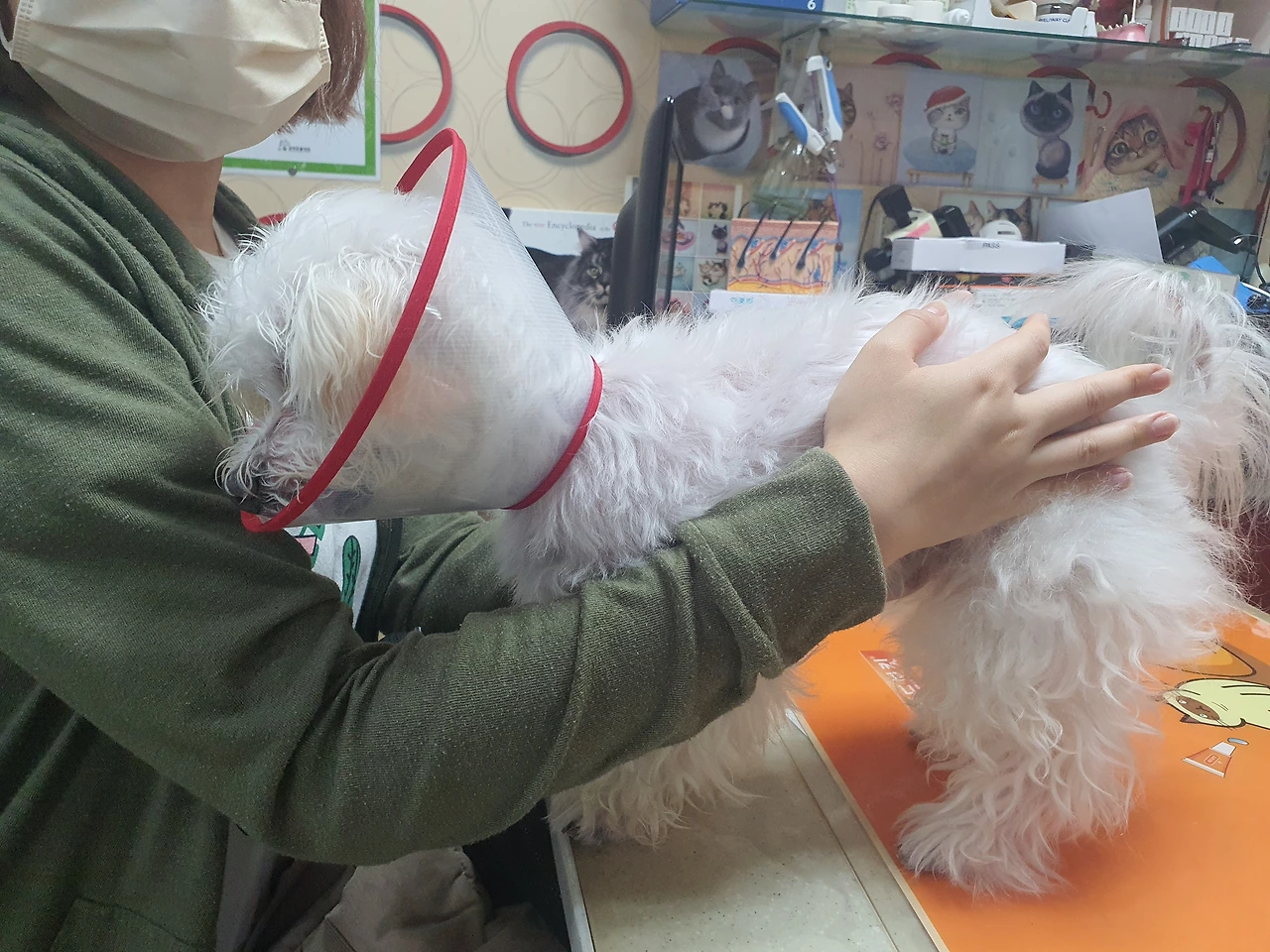 다솜이도 병원에만 가면 딴 강아지가 된듯했다. 어떻게 병원에 가는지 알고선 병원으로 들어서는 길목부터 사시나무 떨듯 온몸을 부들부들 떨었다. 내 팔을 꽉 부둥켜 잡으며 “누.. 누나! 나.. 너무.. 무서워!!”라고 말하는 것만 같았다. 나는 그런 모습이 너무 귀여워서 일부러 모른 척하며 놀리기도 하고 평소보다 더 꽉 안아주기도 하였다.