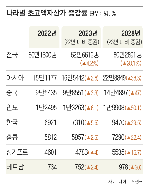 한국의 초고액자산가 수는 2023년 7,310명이고, 2028년에는 9,470명으로 늘어날 거라 전망하고 있다.