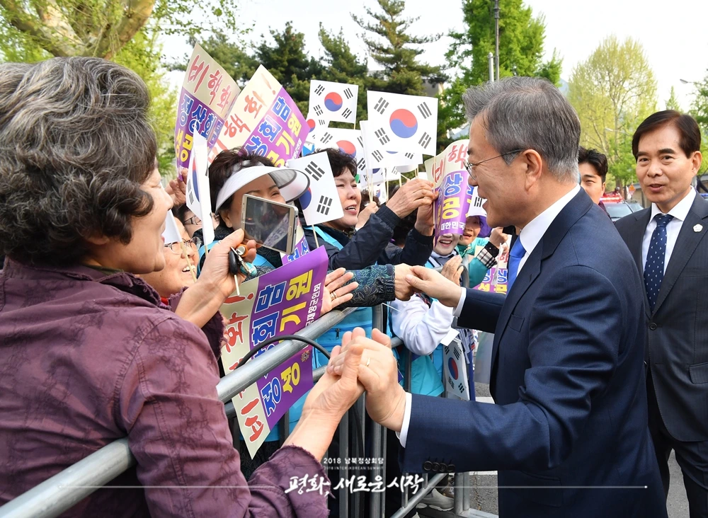 「27일 오전 남북정상회담의 성공을 기원하는 시민과 문재인 대통령이 인사하고 있다」= 공동취재단 =