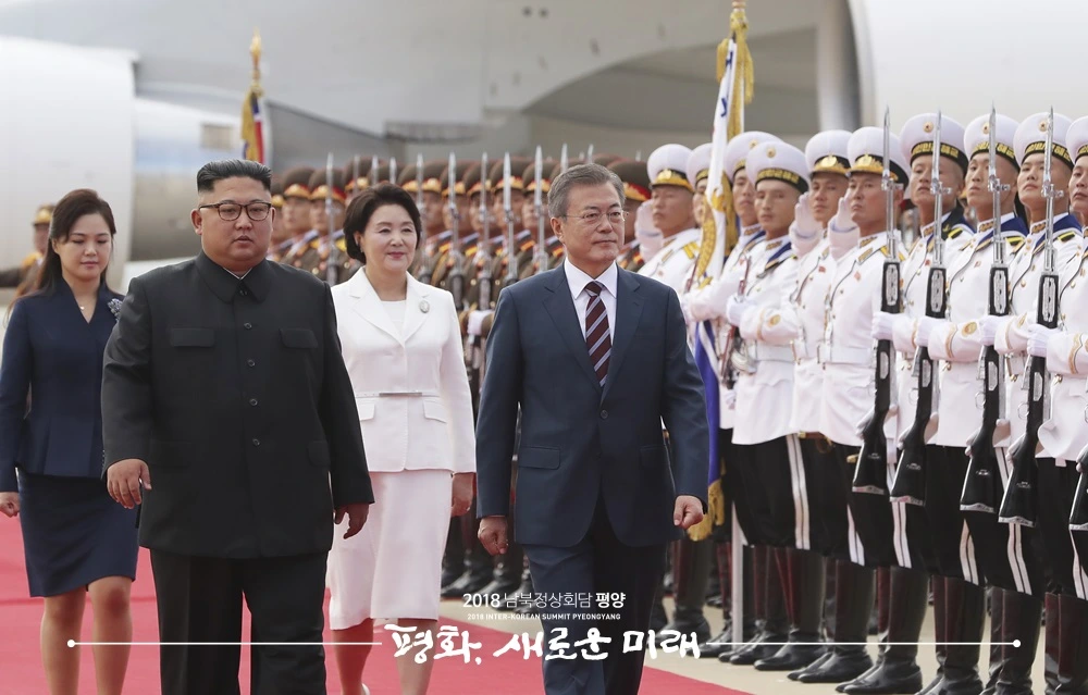 9월 18일 오전 10시, 대한민국 공군 1호기가 평양 순안공항에 도착했다. 김정은 국무위원장과 그의 아내 리설주가 직접 공항으로 나와 문재인 대통령 내외를 영접했다. 공식환영행사는 북한군 명예위병대(한국의 의장대에 해당)의 사열로 시작되었는데, 사열 보고에서 명예위병대장 육군 대좌 아무개가 문 대통령을 "각하"라고 존칭 하는 뜻밖의 장면을 볼 수 있었다. 몇 해 전까지만 해도 대한민국 대통령을 '남조선 괴로군부의 우두머리'라고 욕보였던 것과 달리 "대통령 각하를 영접하기 위해 정열하겠다"라며 예를 갖춰 예식도를 치켜든 모습이 사뭇 새로웠다.
