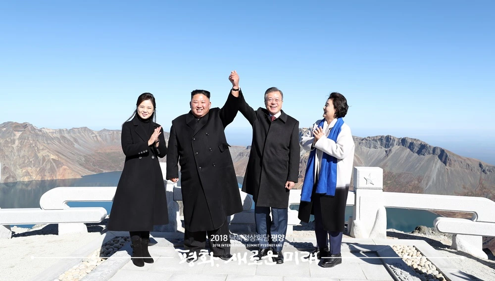 백두산에 오른 양 정상은 천지가 내려다 보이는 장군봉에서 백두산의 절경에 대해 담소를 나누었다. 김정은 국무위원장이 남북관계에 대해 "천지의 물이 마르지 않도록 북남 간의 새로운 역사를 써나가야겠다"라고 말하자, 문재인 대통령은 전날 있었던 '5.1 경기장'에서의 연설을 언급하며 "이번에 제가 오면서 역사를 좀 썼다"라고 화답했다. 시종 화기애애한 분위기였다. 김 위원장이 천지가 내려다 보이는 곳에서 기념 촬영을 하자고 제안했고, 본인이 직접 문 대통령 내외와 남측 대표단을 찍어주겠노라 농담을 하기도 했다.