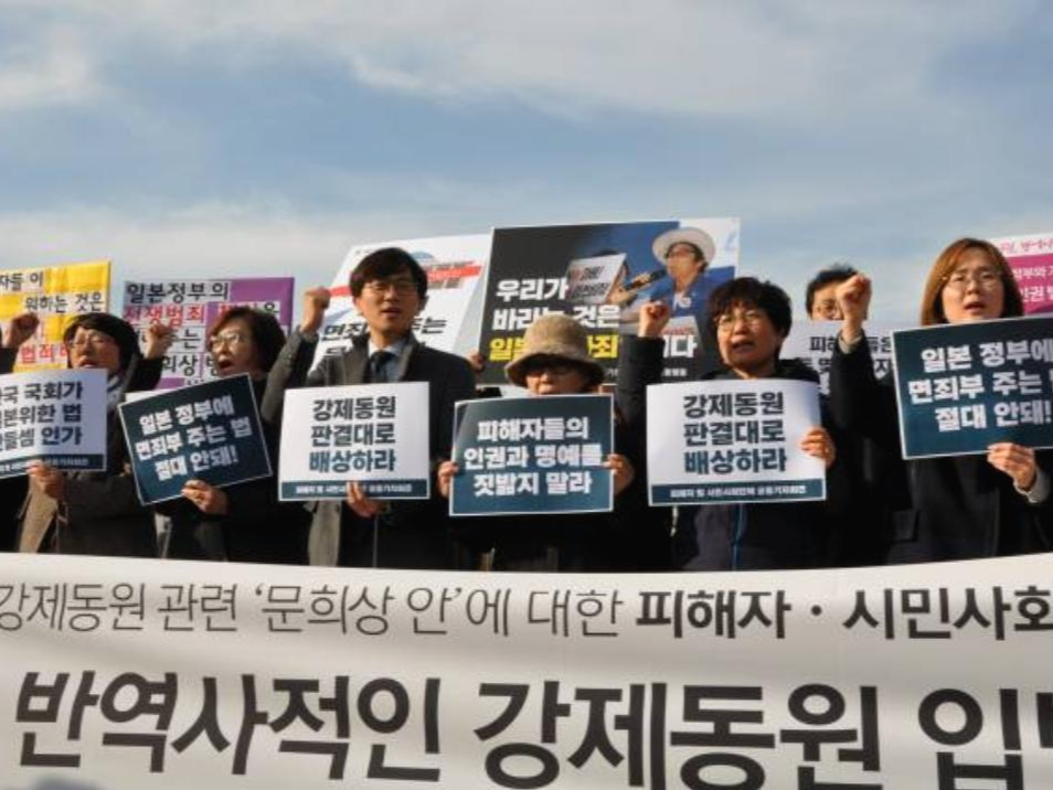 「2019년 11월 27일 강제동원 피해자 지원단체 관계자들이 '문희상 안'의 즉각 폐기를 요구하고 있다」