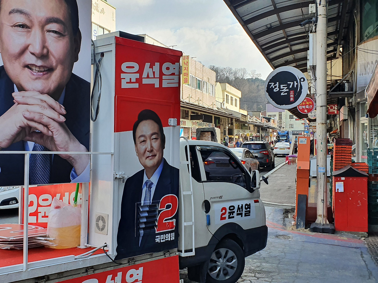 「산성시장 도로에 정차 중인 윤석열 후보 유세 차량」반면, 국민의힘 진영은 한껏 고양된 분위기다. 국민의힘 지역 관계자 J 씨는 윤석열 후보가 '충청의 아들'임을 강조하고 있어 "지역적 애착이 작용하였는지 윤 후보에 대한 공주시민의 관심이 대단히 높다"라고 자평했다.