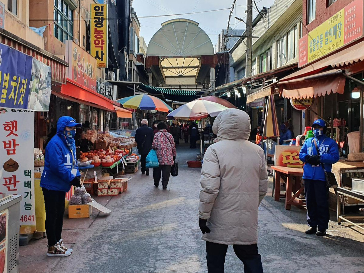 「공주시민에게 지지를 호소하는 이재명 후보 선거운동원」산성시장은 어르신들의 사랑방 역할을 톡톡히 하고 있었다. 시장 골목 안쪽에 자리한 방앗간에서 수다 삼매경에 빠져있던 Y 씨는 올해 80세가 됐지만 여전히 매일 아침 미용실의 문을 연다. 그는 아직 가위질에 문제가 없다며 손가락을 까딱까딱 움직여 보였다.
