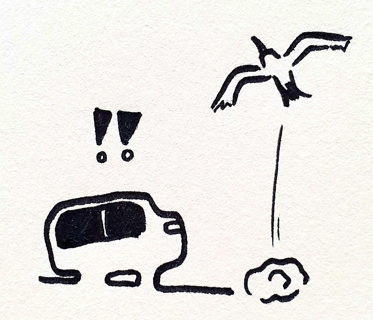 차체에 충격을 주는 요소는 스톤칩뿐만이 아니다. 짱돌만큼 강력한 위험요소가 있으니 그건 바로 새똥. 새똥에는 요산 성분이라는 게 있는데 PH3.0~4.5의 강한 산성도를 가지고 있다. 부식성이 강해 새똥을 맞은 채 오래 방치된 차는 새로 도색을 해야 할 수도 있다. 나는 새똥의 무서움을 안다. 2019년 호주 여행을 갔을 때 놀랍게도 새똥을 세 번이나 맞았다. 시드니 오페라 하우스 계단, 패러데일 동물원, 멜버른 로얄 보타닉 가든 티 하우스에서다. 너무 충격적인 사건이라 여행 노트에 정확히 써 놨다. 새똥 냄새는 지독하고 잘 지워지지 않는다. 따라서 새똥은 발견하는 즉시 제거하는 게 최선이다. 하지만 새똥이 이미 말라버렸다면 조심해서 닦아내야 한다. 새똥에는 모래나 딱딱한 결정체가 섞여 있을 수 있다. 도장 표면에도 갖은 먼지들이 달라붙어 있기에 그냥 문지르면 상처가 나기 쉽다. 우선은 물을 충분히 적신 키친타월을 새똥 부위에 지그시 눌러놓는다. 잠시 후 톡톡 두드리며 떼어낸다. 몇 번을 반복한 후 마른 키친타월로 닦아내면 안전하다. 자나 깨나 새똥을 조심하자.