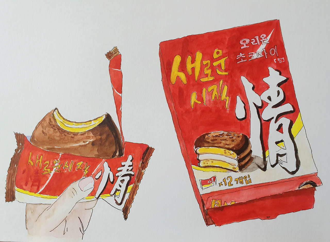 살이 찐다며 마시멜로만 분리해 먹거나, 초코파이를 봉지 채 주물러 초코똥 모양으로 만드는 친구도 보았다. 마시멜로 때문에 초코파이 한 개를 먹으면 지구 한 바퀴를 돌아도 살이 빠지지 않는다는 괴담도 여러 번 들었다. 초코파이는 너무 익숙한 과자였고, 익숙했기에 곁에 있어도 눈에 보이지 않던 과자였다. 그러다 러시아, 베트남, 중국, 인도, 북한, 미얀마, 몽골 등의 나라에서 사람들이 초코파이에 열광한다는 소식을 들었다. 몇몇 나라에서는 초코파이를 제사상에 올릴 정도로 귀한 대접을 한다는 기사도 읽었다. 응? 내가 아는 그 초코파이가? 그제야 초코파이가 새롭게 보였다.