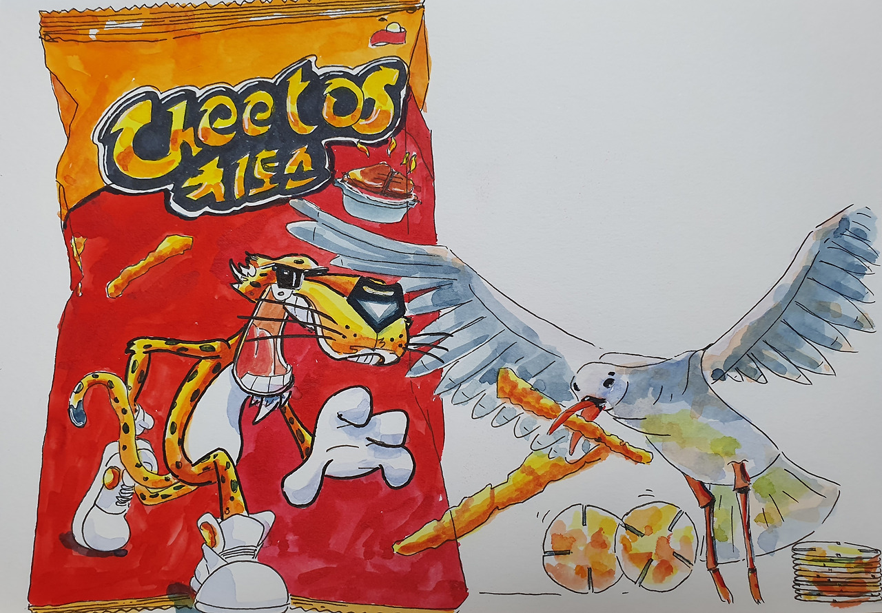 따조가 나오기 이전, 치토스 봉지 안에는 체스터가 그려져 있는 스티커가 들어 있었다. 체스터는 치토스 봉지에 그려진 마스코트 치타의 이름이었다. 스티커 뒷면에 있는 원을 동전으로 긁으면 문구가 나왔다. 문구는 둘 중 하나였다. ‘꽝! 다음 기회에’ 혹은 ‘한 봉지 더’ 보통은 꽝 스티커가 나오기 마련이라 ‘한 봉지 더’ 라는 문구가 나오면 심장이 터질 듯 기뻤다. 스티커를 들고 슈퍼로 달려가 치토스 한 봉지를 무료로 받았다. 우리는 치토스를 사자마자 봉지를 뜯고 스티커를 꺼내 동전으로 뒷면을 긁었다. 과자는 나중에 천천히 먹어도 될 일이었다.