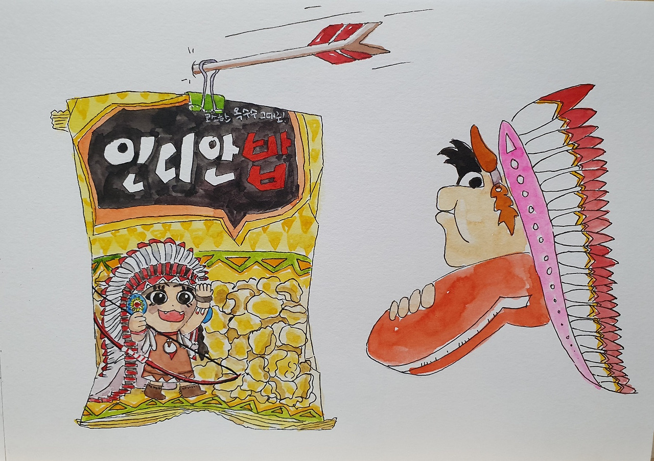 어렸을 적 인디안밥은 과자보다는 벌칙으로 더 유명했다. 다 같이 둥글게 모여 앉아 게임을 하다 걸리면, 걸린 사람은 고개를 숙이고 앞쪽으로 상체를 길게 늘린다. 남은 사람들은 ‘인디안~~밥’이라고 소리치며 엎드린 사람의 등짝을 손바닥으로 마구 내려친다. 대개 살살 치는 시늉만 하지만 누군가는 앙심을 품은 듯 호되게 치는 경우도 있다. 그 시절 벌칙 받던 기억을 떠올리니 갑자기 등이 아파온다. 누가 내 등짝을 팔꿈치로 찍어 눌렀는지 기억은 나지 않지만, 언젠가 잡히기만 해라. 인디안밥을 입안에 통째로 부어버릴 테다.