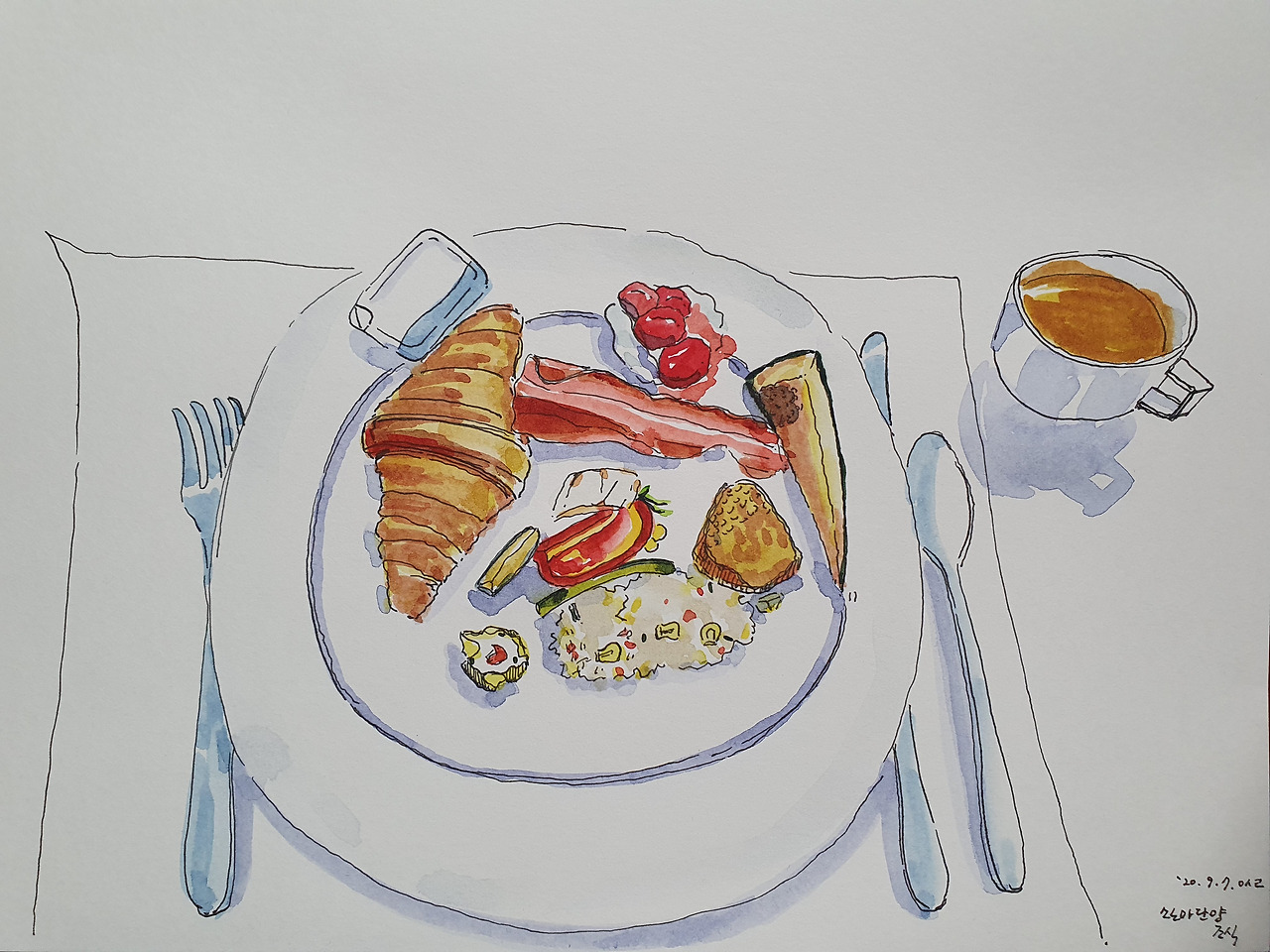 나보다 늦게 일어나던 습관을 이기고 나를 깨운다. 아침을잘 먹지 않던 습관을 깨뜨리고 꼬박꼬박 챙겨 먹는다. 평소엔 먹지도 않던 맛없는 빵과 볶음밥, 감자튀김, 베이컨 등으로 인하여 과식을 한다. 나도 덩달아 과식한다.
