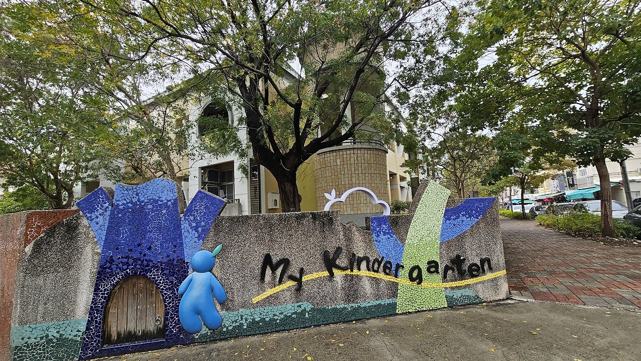 타이중 충효국민초등학교 및 초등학교 부설유치원의 모습(위) 부설유치원 외벽 및 놀이터(아래) 다음은 타이중의 우펑구에 있는 타이중 시민 밍타이고등학교이다. 임헌당박물관단지가 유명해서 찾아갔는데, 의외로 박물관은 학교내에 있었다. 남편과 주로 무봉임가래원(연못)을 구경하고 박물관단지는 들어가지 않았다. 실상은 연못보다 학교길이 좋았다. 운동장 트랙을 따라 서있는 나무가 마치 거대한 파라솔처럼 연결되어 아이들을 보호해줄 것만 같았다. 영화 한편은 찍을 만한 풍경이다.