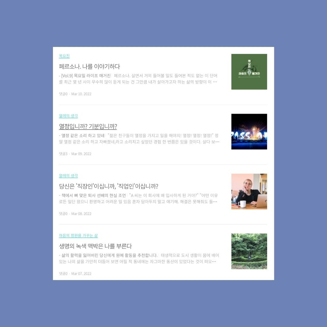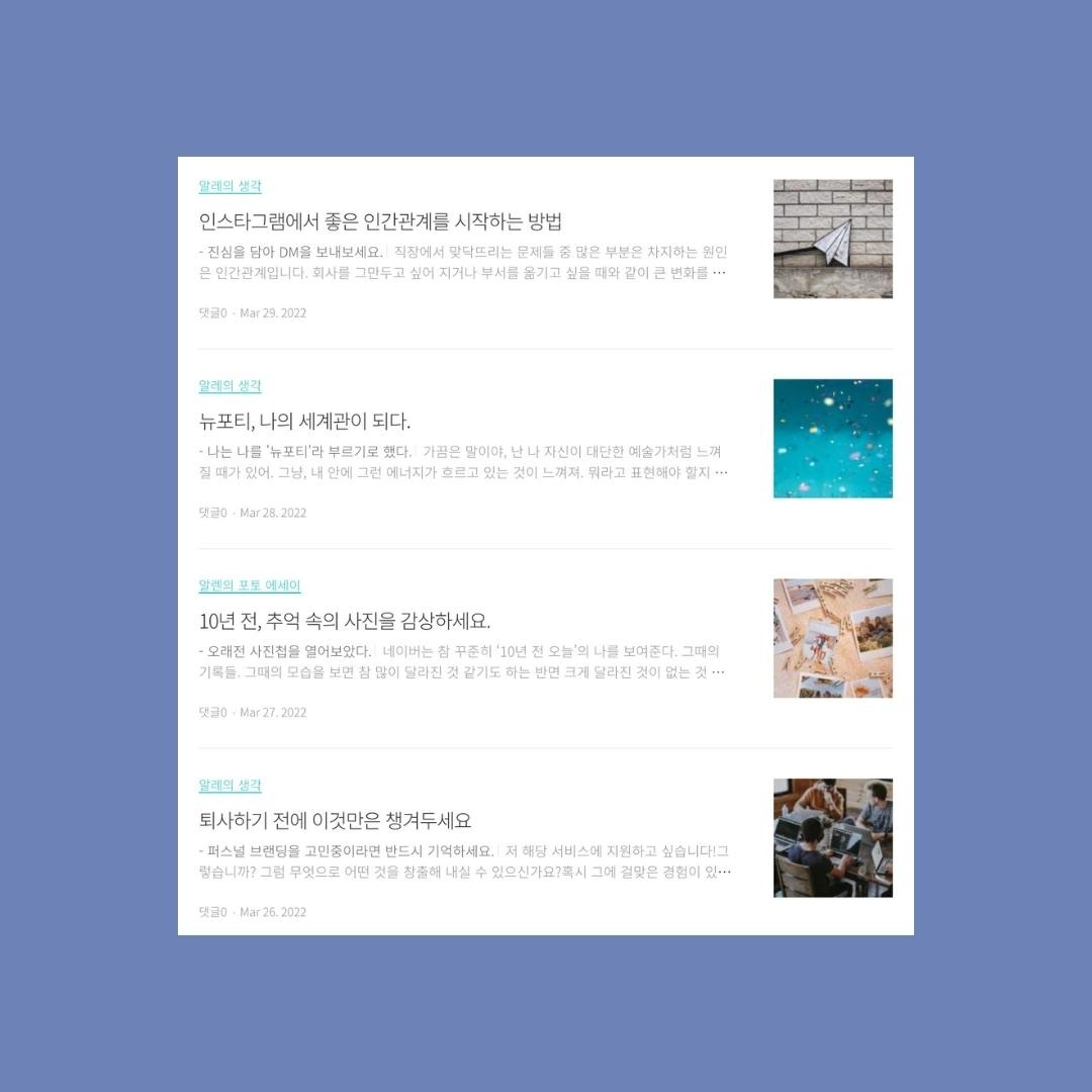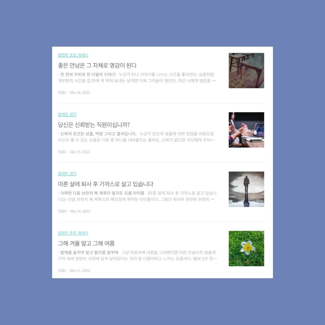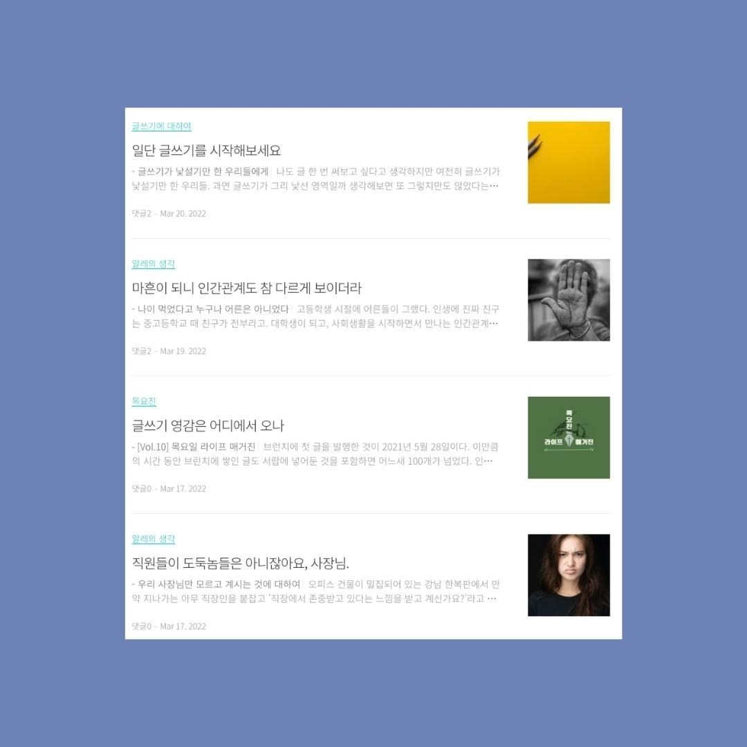 현재 활용하고 있는 글쓰기 플랫폼이 브런치를 포함하여 블로그, 그리고 인스타그램까지 세 개를 운영하다 보니 어느 한쪽에 집중하다 보면 나머지에 다소 소홀해지게 된다. 지난 한 두 달은 블로그에 집중하다 보니 자연스레 브런치에 발행하는 글의 양이 상대적으로 적어다.