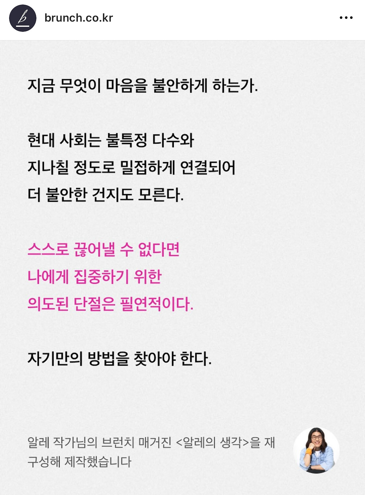 나의 글은 일상의 전반을 담고 있다. 그러다 보니 어떤 특정 방향성을 가지고 있지는 않다. 그만큼 퍼스널 브랜딩 측면에서는 힘이 약할 수밖에 없단 소리다. [틈]에 소개된 글도 그중의 하나였을 뿐이다. 그때 유독 연결 중독자가 돼버린 듯한 나의 모습을 돌아보며, 그로 인해 오히려 불안이 가중 돼버린 삶에 대한 해답으로 끊어냄을 이야기하고 싶었다.