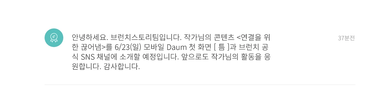 솔직히 브런치에 글을 쓰다 보면 괜스레 마음 설레게 하는 알림이 있다. 누군가가 나에게 제안 메일을 보냈다는 알림이다. 그런데 브런치 팀의 메시지는 그 이상이었다. 마치 내 글이 제대로 인정받는 기분이었다.