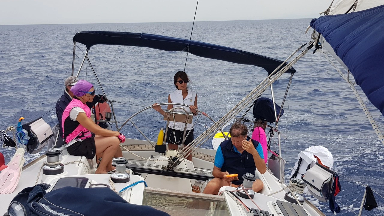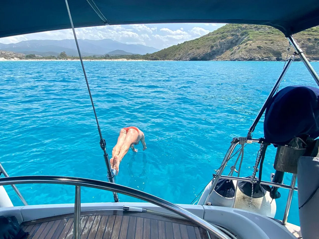 지중해의 여름은 기온이 높지만 바람이 건조합니다. 그래서 세일링 하는 동안은 더위를 잘 느끼지 않습니다. 하지만 배를 멈추고 닻 내리는 짧은 시간 내에 바다로 뛰어들고 싶은 열망이 쌓이죠. 닻내림을 확인하자마자 다들 앞다투어 물로 뛰어듭니다.