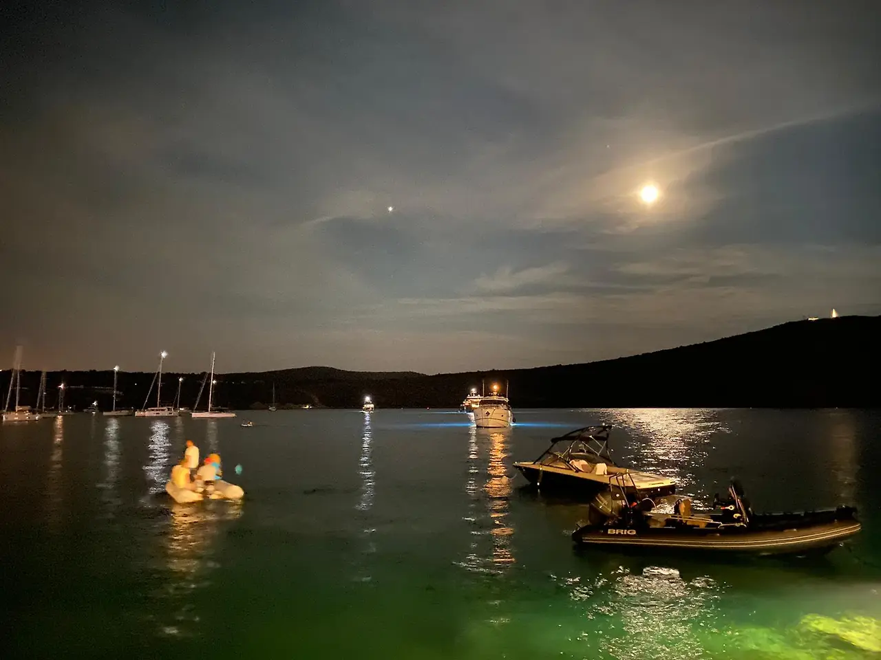 앵커 라이트(닻 내린 배가 마스트 꼭대기에 켜 놓는 조명)를 켠 세일링 요트들과 보름달을 조명삼아 모선으로 돌아가는 고무보트... 남친과 분위기 잡다 말고 핸드폰을 꺼내 사진을 찍을 수 밖에 없었다더군요.