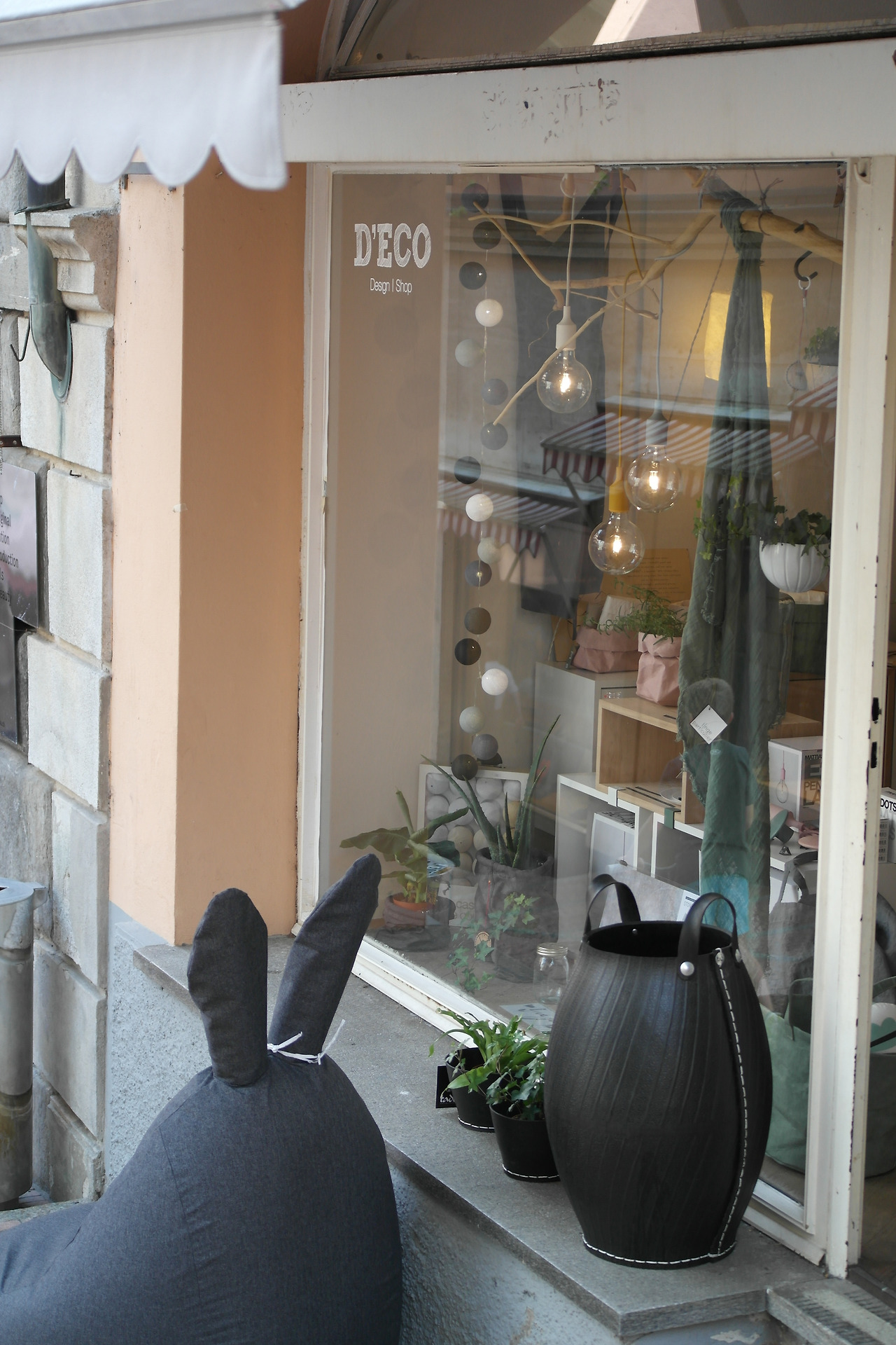 어떤 재미난 제품이 있는지, 그리고 편집샵 브랜드는 무엇인지, 그리고 심지어 신상품이 이곳에 있는지 없는지 까지...이렇게 분석하듯 보다 보면 상점 주인이 와서 말을 거는 것이 매우 불편해지는 순간이 있다. 그럴 땐 눈을 마주치며 "예뻐서 구경 중이에요"라고 말하며 살짝 미소를 날려 드린다. 데코라는 단어를 재치 있게 D'ECO로 쓰고 school 폰트로 작업한 이 브랜드가 참 맘에 들었다. 뿐만 아니라 매장 앞에 뚝심 있게 앉아있는 회색토끼 쿠션도 함께 D'ECO 브랜드의 이미지를 소비자들에게 친근하게 잘 부각하고 있어 보였다.