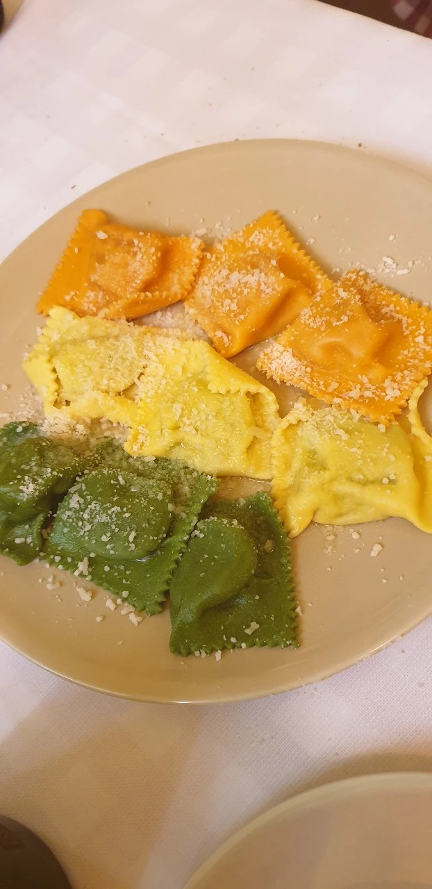 마지막 오늘을 장식할 파스타로 Ravioli(라비올리)를 주문했다. 한국식 작은 만두라고도 표현되는데 파르마에서 시작되었다고 한다. 이탈리아 국기처럼 보이는 라비올리는 우리나라 떡 같아서 쫄깃쫄깃한데, 솔직히 앞에 너무 맛있는 살라미, 프로슈토, 조각 치즈를 먹어서 인지 큰 감동이 없었다.