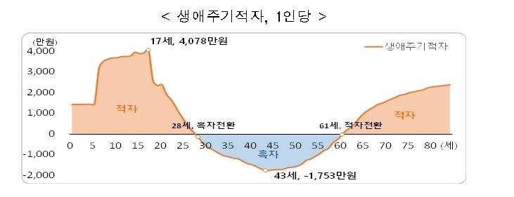 우리는 28세까지 적자 인생을 삽니다. 어린 시절은 부모에게 매년 최대 4,000만원을 의지합니다. 28세부터 돈을 벌지만 박봉의 직장 생활에, 결혼을 하고, 자식을 부양하고, 높은 물가에 허덕이면서, 매년 1,000만원을 모으기가 힙듭니다. 그리고 43세에 정점을 찍고 소득이 감소합니다.