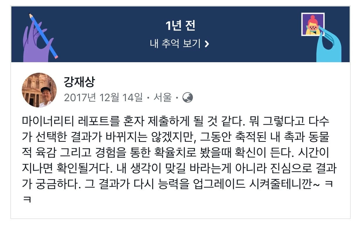 1년이 지난 지금, 그 때 마이너리티 레포트 혼자 제출했는데 그 판단이 정확했다. 스타트업 캠퍼스 파이널PT시 심사했던 내용인데 지금 생존여부와 성장여부로 결과가 나와있기 때문이다. 내 판단이 맞았다.이때가 스캠 이노베이션 3기, 6개월전 수료한 4기도 마찬가지로 정확히 맞췄다. 그런데 오늘은 5기 파이널PT군... ㅋㅋ