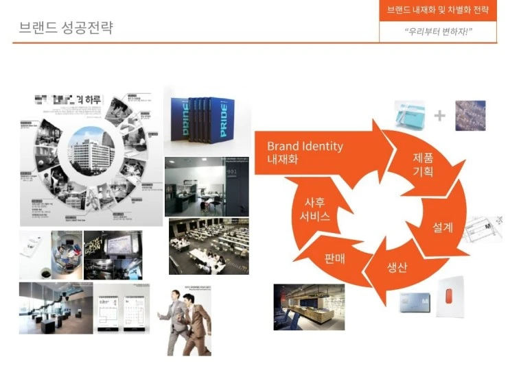 상단 이미지의 ㅇㅇ사 사례처럼 내재화가 제품기획과 설계, 생산, 판매, 사후 서비스를 거쳐 다시 브랜드 내재화에 결과가 반영되어 전형적인 Plan-Do-See의 형태로 지속적으로 진행되어야 성공적인 브랜드 내재화가 될 수 있다. 또한 사람과 공간, 프로그램, 프로세스 4개의 축으로 임직원들의 Life Cycle과 Life Style에 딱 맞춘 다양한 각도의 접근으로 변화를 가져올 수 있다. 포인트를 짚자면, 정말 세밀하게 계획을 짜서 실행해야 하고 병적일 정도로 집요하게 오랜 기간 지속할 수 있어야 한다. 예를 들어, 임직원들의 생활 속에 브랜드가 자리잡도록 하기 위해 데스크용품을 활용한다거나 화장실에 있는 메시지 전달보드, 회의실의 화이트보드나 탁상 등을 이용할 수 있다. 그리고 의사결정의 기준 중 하나를 우리의 브랜드 아이덴티티에 적합하느냐를 고려하고 임직원들 간의 커뮤니케이션에서 자연스럽게 브랜드 용어가 튀어나오도록 유도할 수 있다. 또한 각 조직별로 브랜드 앰버서더를 선정하고 사내 브랜드 내재화 TFT를 운영하여 브랜드 내재화를 가속화할 수 있다.