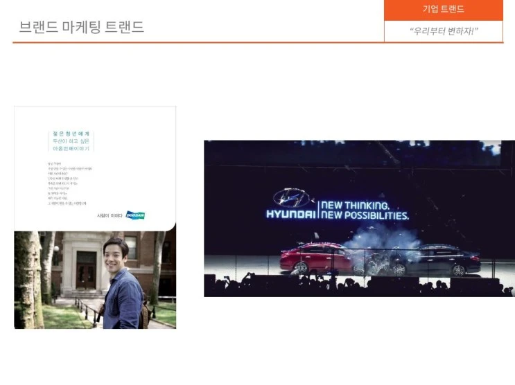 두 가지 사례를 보자. 좌측은 훌륭한 브랜드 이미지를 수년 동안 지속적으로 쌓아 엄청난 자산이 되었다가 2015년말 신입사원 구조조정 사건으로 순식간에 브랜드 이미지가 망가진 경우이다. 우측은 커뮤니케이션의 진실성에 대해 끊임없이 의심을 받아온 기업이 의심하는 고객들을 대상으로 제품품질에 대한 논란을 끝내기 위해 기자와 일반인들을 상대로 자동차 충돌실험을 실시한 사례이다. 두 기업 모두 매해 수백억에서 수천억원 이상의 마케팅 커뮤니케이션 비용을 사용하고 있다. 두 사례에서 알 수 있는 것은 외부 고객과 소통하기 위한 수단으로서 브랜드를 단순히 활용할 경우 문제가 생길 수 있다는 점이다. 고객과의 소통은 기업 전체와 고객과의 일관적이고 진솔한 대화이어야만 하며, 주로 고객을 상대로 하는 기업 일부 조직만의 책임이 아니다. 기업들은 기업의 테두리 밖에 있던 브랜드를 기업 내부로 가져와서 브랜드를 기업 내부 고객들이 먼저 변화해야만 그 변화가 외부 고객들에게 전달됨을 알게 되었다. ‘브랜드 내재화’가 기업들 간에 트랜드로 자리 잡기 시작했다.