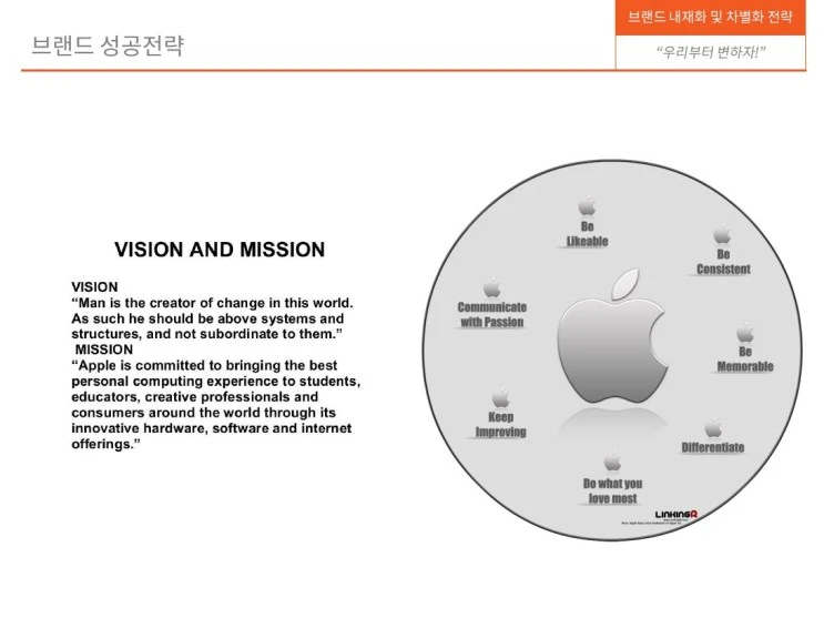 바로 밑의 이미지를 보자. 애플의 비전과 미션이다. 내용만 보면 조금 추상적으로 느껴질 수도 있으나, 비전을 미션과 연계하고 그 동안의 애플 이미지나 제품, 서비스 등을 떠올려보면 얼마나 구체적이고 장기적인 방향성을 제시하는지 알 수 있다.