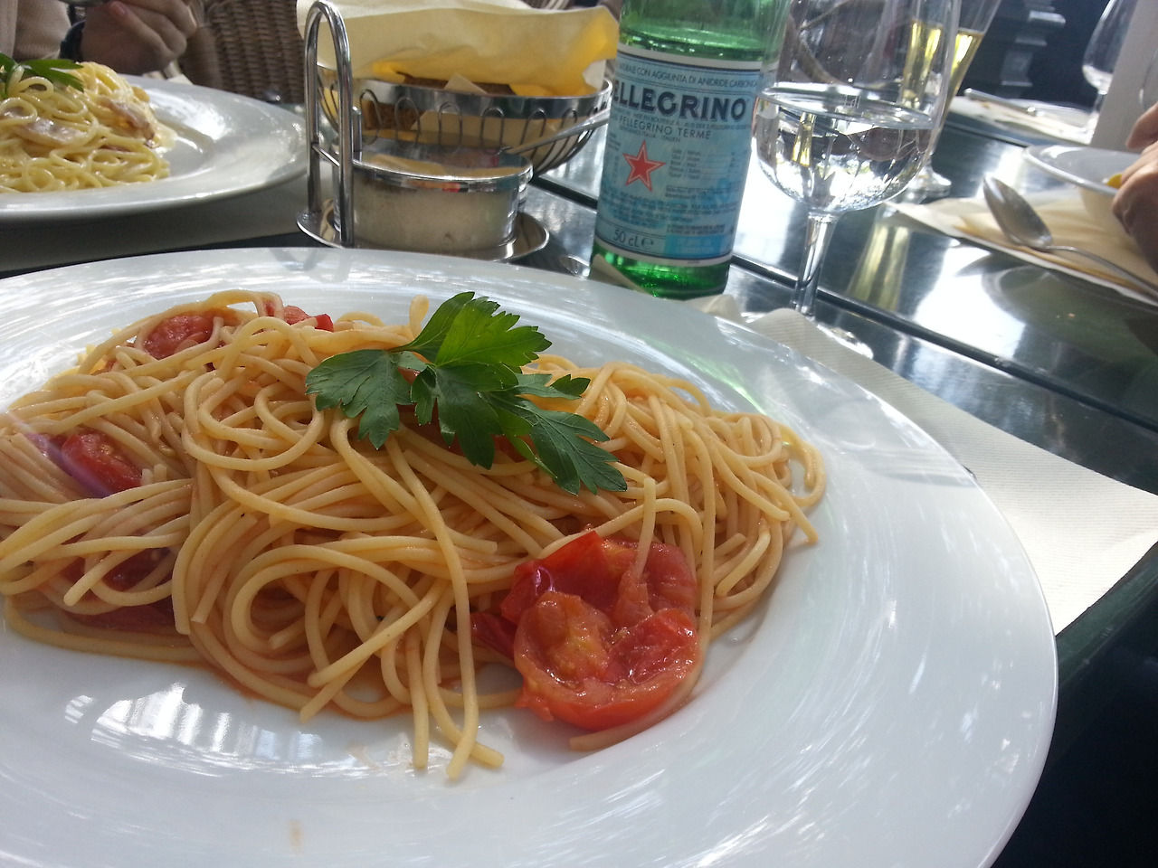 파스타를 포함한 몇가지 음식들을 주문했고, 탄산수를 마셨다.