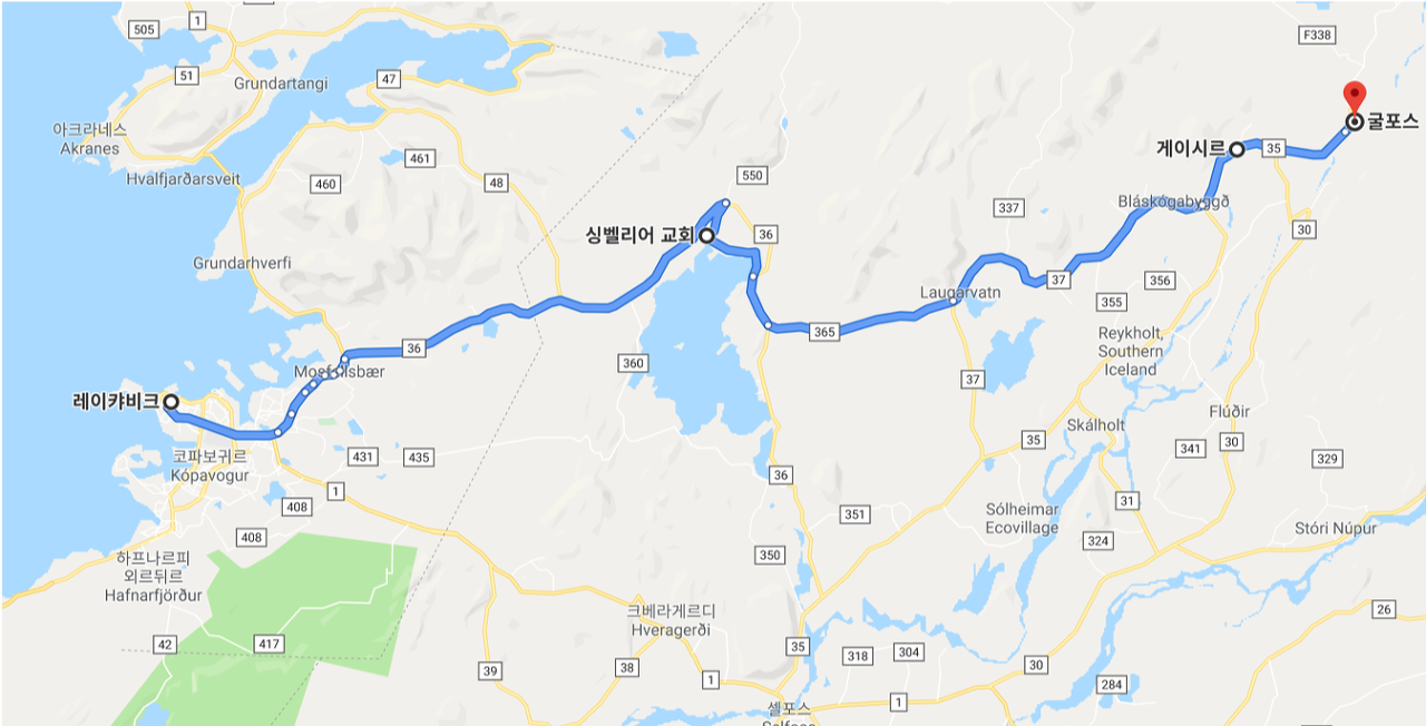 게이시르에서 간헐천에 매력에 푹 빠졌던 우리는(천년의 역사 싱벨리르와 숨 쉬는 지구 게이시르) 늦기 전에 매점에서 샌드위치와 물을 사서 들고 굴포스로 차를 몰았다.(샌드위치와 물 한 병이 대략 2만 원 꼴이다. 역시, 혀를 내두르는 물가에 다시 한번 웃고 말았다.) 하지만, 그리 서두를 필요가 없었던 것이 게이시르에서 굴포스까지는 매우 가까워서 불과 20분 정도밖에 걸리지 않았다. 게이시르에 도착할 때만 해도 비가 주룩주룩 내렸으나, 변화무쌍한 날씨의 아이슬란드는 굴포스에서 너무도 화창한 파란 하늘로 반겨주고 있었다.