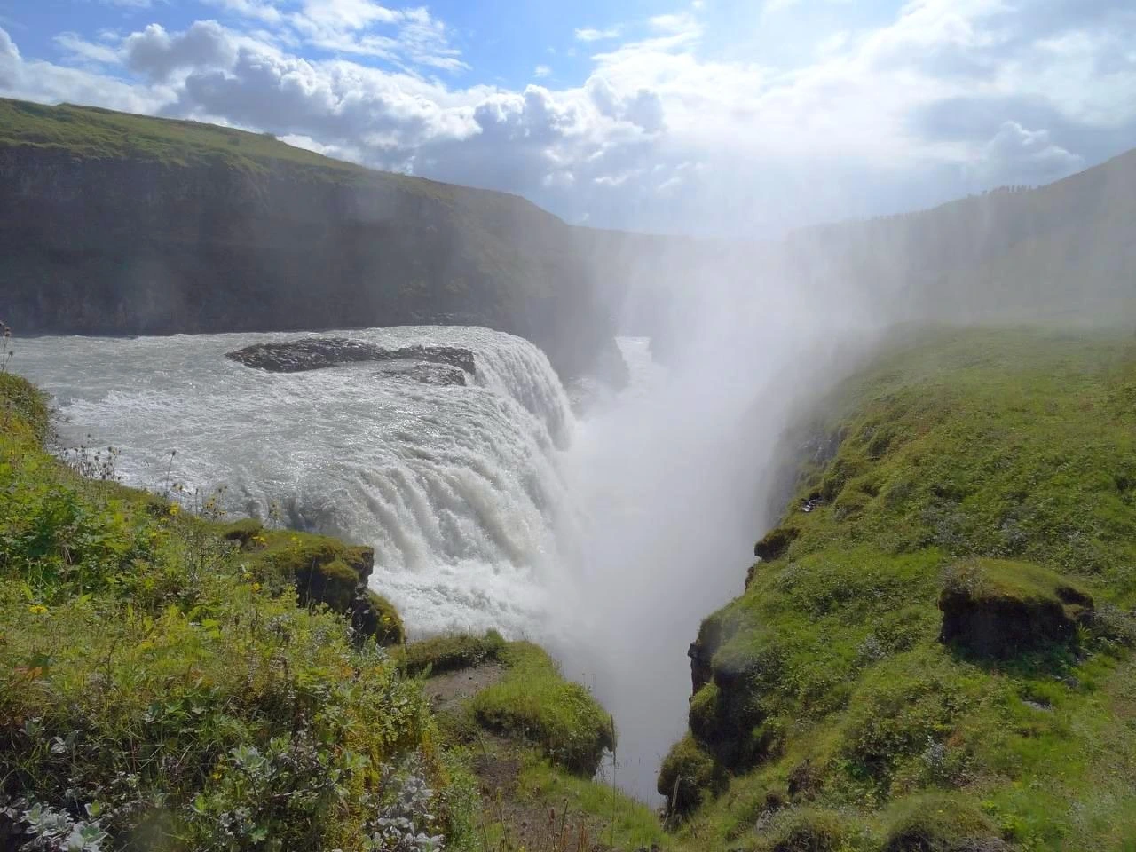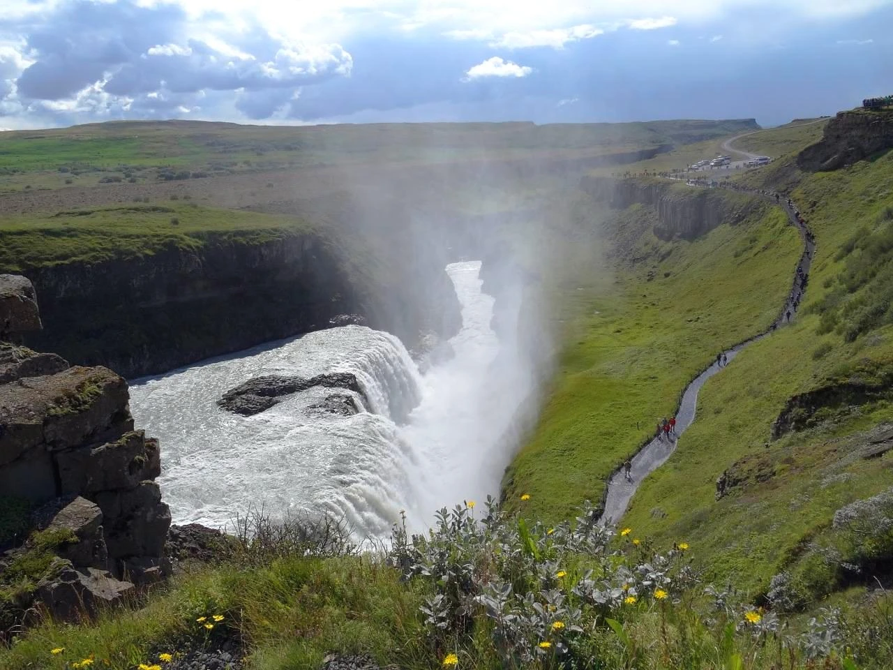 주차장에 차를 세우고 차 문을 열었더니, 쿠우우- 하는 웅장한 소리가 들리고, 앞쪽에서 엄청난 물보라가 수증기처럼 하늘로 솟아 올라가고 있었다. 예전에 나이아가라 폭포에서는 천지를 진동하는 폭포 소리와 압도하는 높이, 엄청난 수량에 온 몸이 위압감에 눌렸었는데, 굴포스는 느낌이 다르다. 나이아가라가 오랜 세월 동안 주변을 지배해 온 전성기의 왕의 느낌이라면 굴포스는 왠지 절제된 규칙을 지키는 모범생 같은 느낌이랄까.