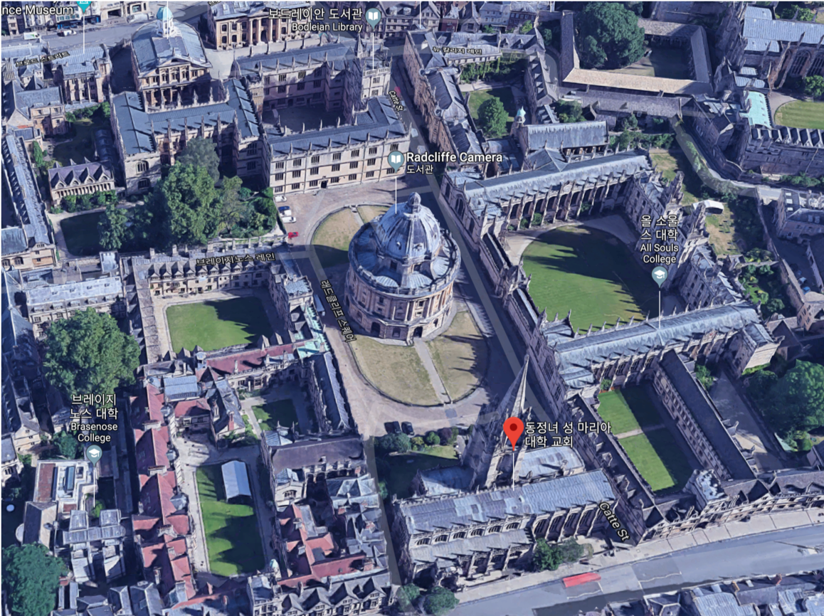 눈 아래로 올 소울스 칼리지(All Souls Colledge)의 장엄한 건물과 반대쪽으로는 화려한 크림슨 색의 브레이즈노즈 칼리지(Brasenose Colledge) 건물이 펼쳐져 있었고, 그 사이의 광장에는 원형의 래드클리프 카메라(Radcliffe Camera) 도서관 건물이 옥스퍼드의 또 다른 랜드마크인 양 우뚝 서 있다.