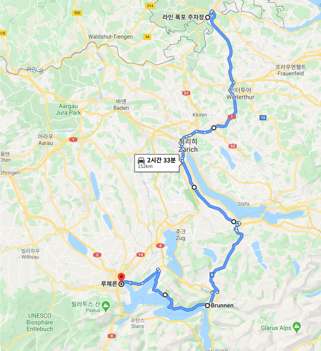 새벽에 런던을 출발한 스위스 여행 첫날, 우리는 오전에 라인 폭포를 들러 첫날밤을 지낼 루체른으로 출발했다. (뜻밖의 발견, 스위스의 라인 폭포)