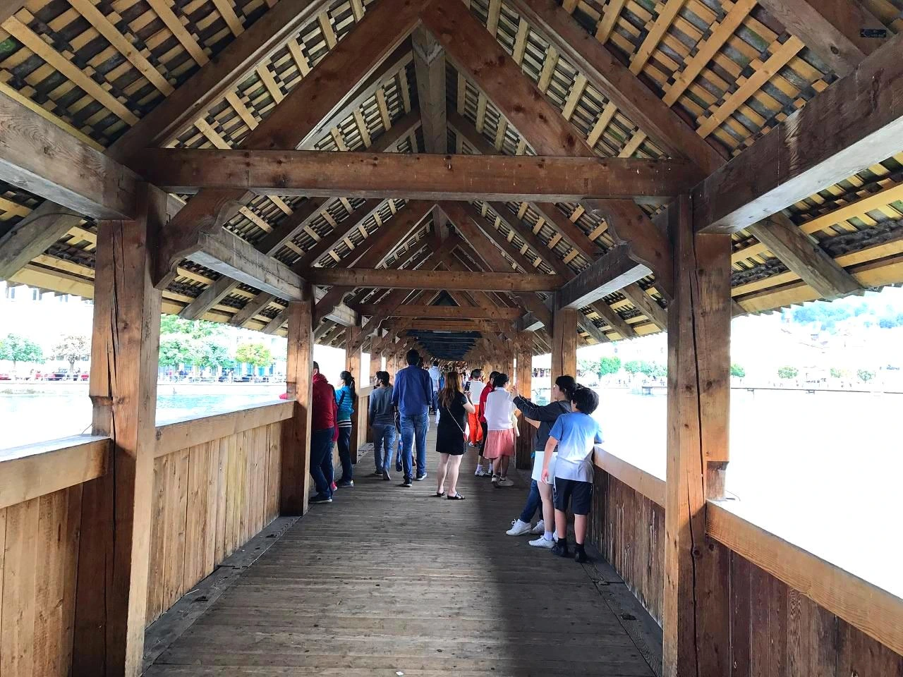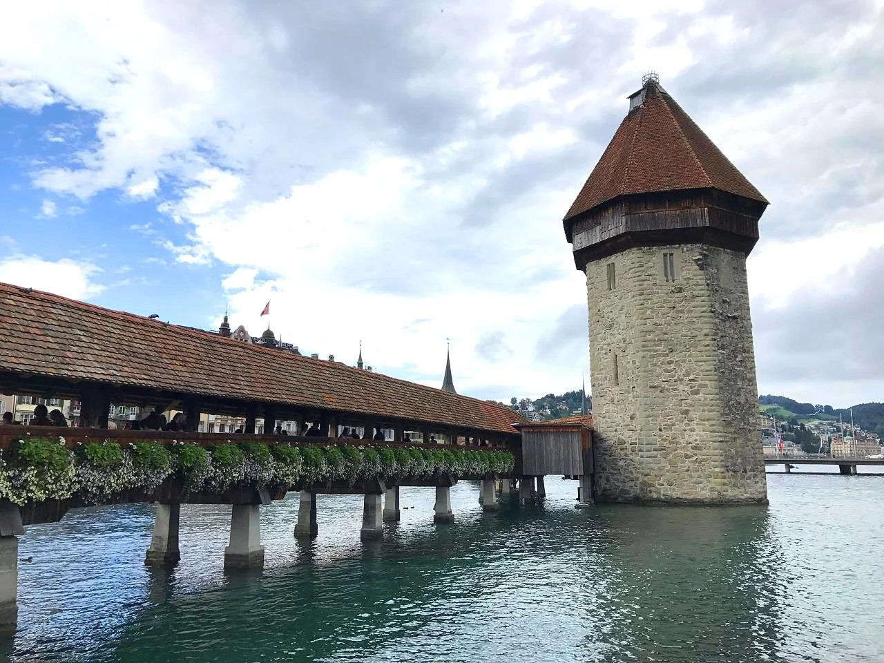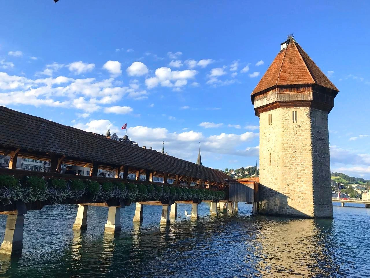 카펠교는 유럽에서 가장 오래된 지붕이 있는 목조 다리로 1365년에 건설되었다. 길이가 약 204미터에 이르고 중간에는 살짝 지그재그 형태로 굴절되면서 로이스 강을 대각선처럼 가로질러 강의 양쪽을 잇고 있는데, 강 위의 타워와 어우러져 그 아름다움이 돋보인다.