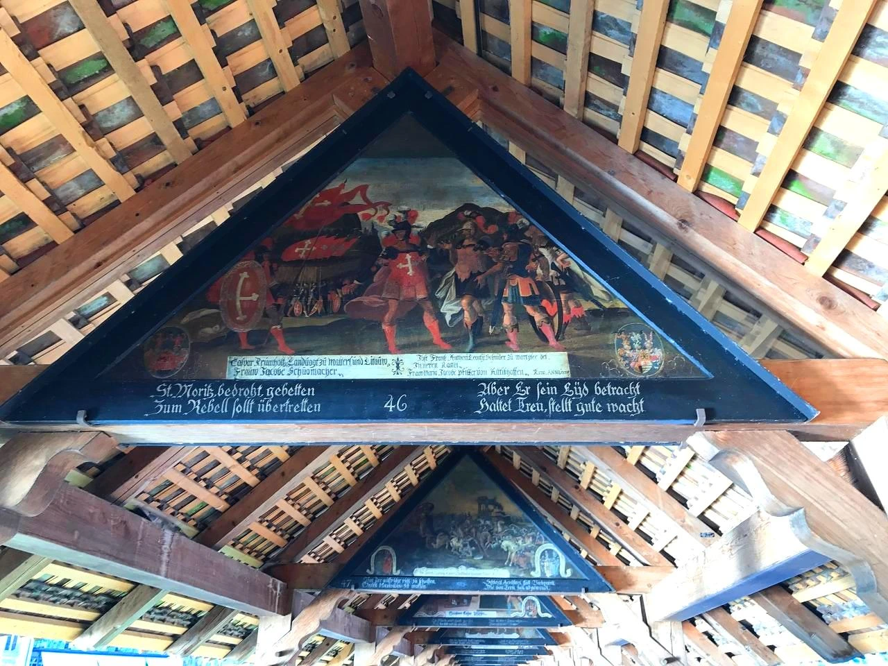카펠교 지붕 아래에는 스프레우어교와 마찬가지로 삼각형 패널에 그림이 그려져 있다. 유럽에서 지붕을 얹은 목조 다리에 이런 패널화를 그려둔 곳은 루체른이 유일하다.