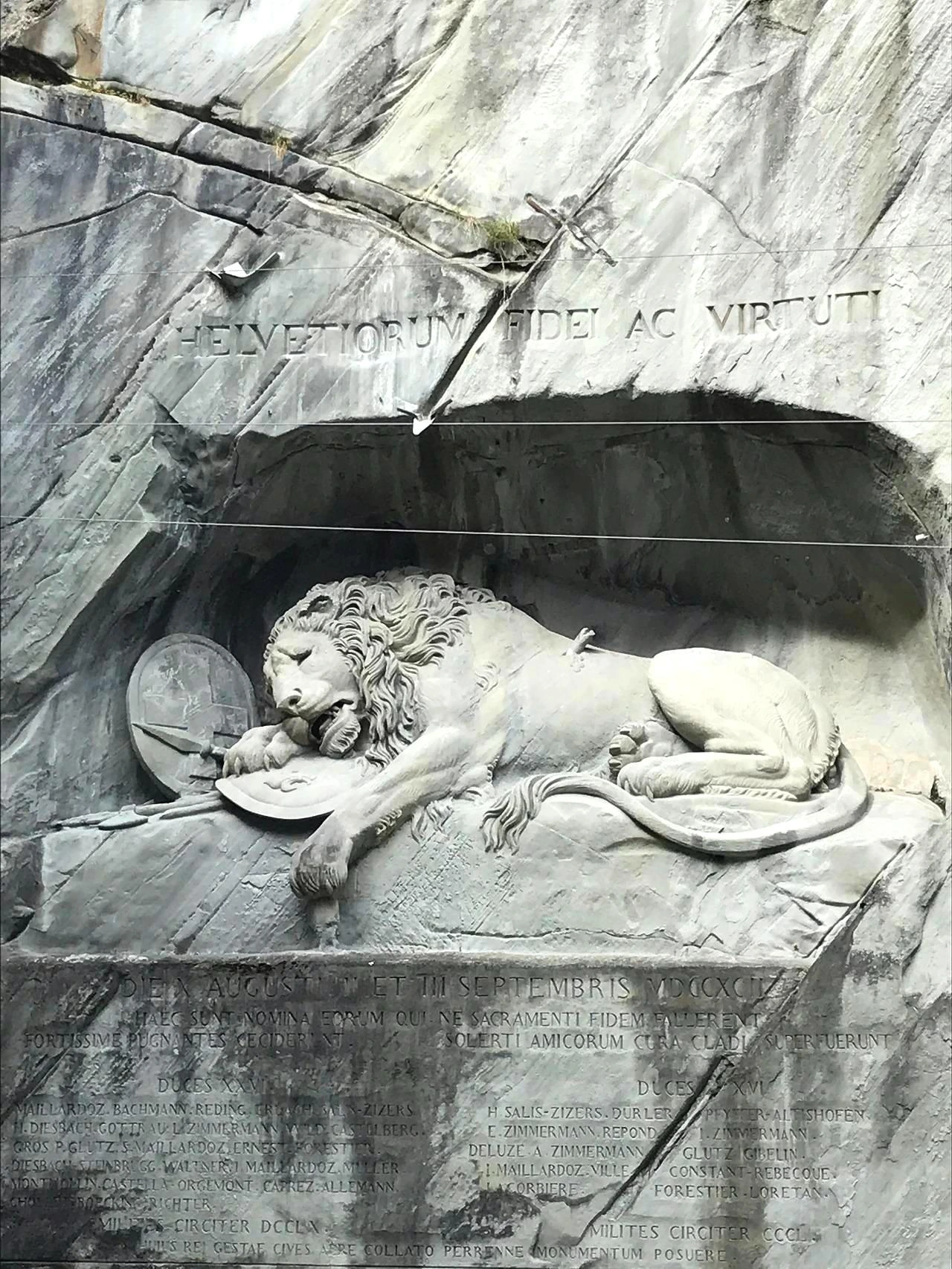 암벽 위에는 라틴어로 "HELVETIORUM FIDEI AC VIRTUTI", 즉 "헬베티아인(스위스인)의 충성심과 용기"가 깊게 새겨져 있다.