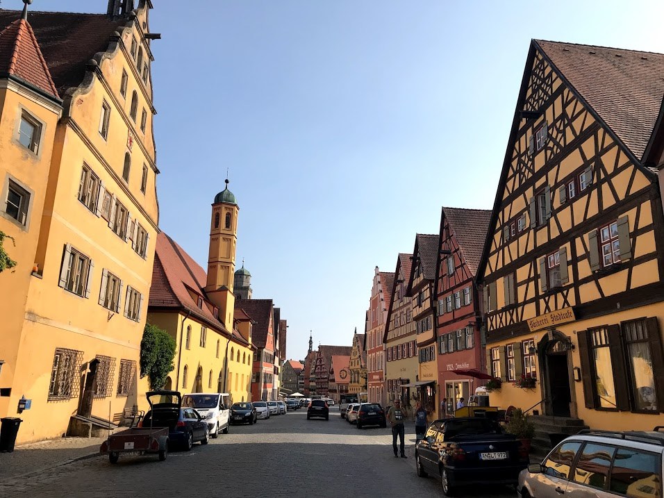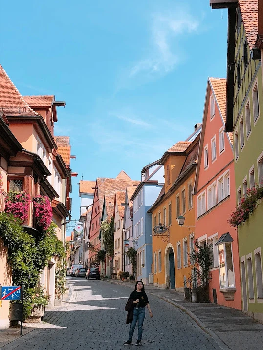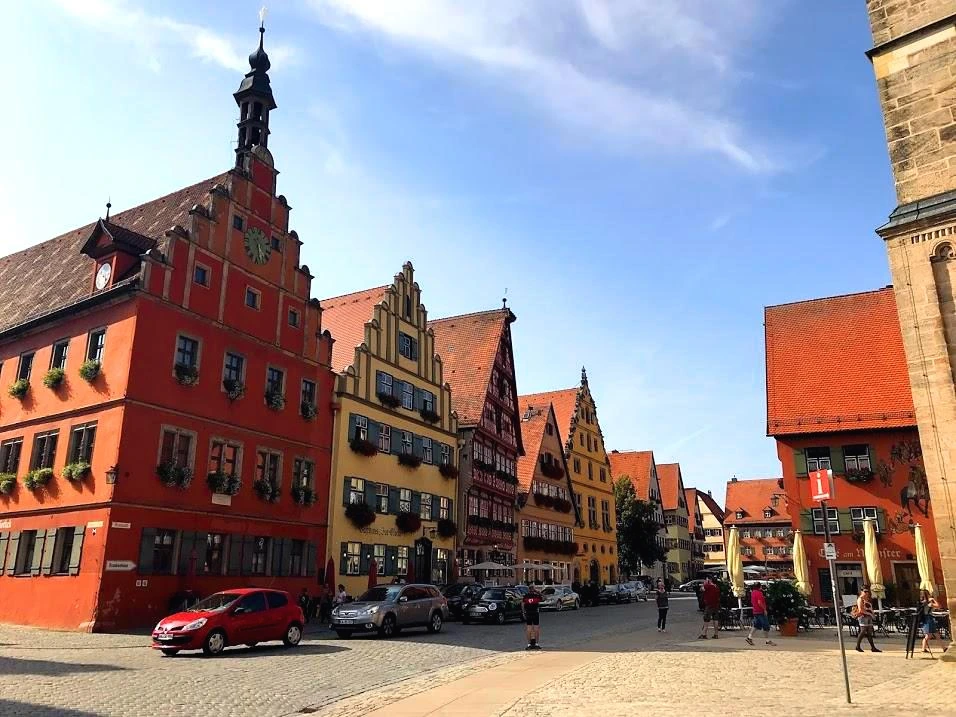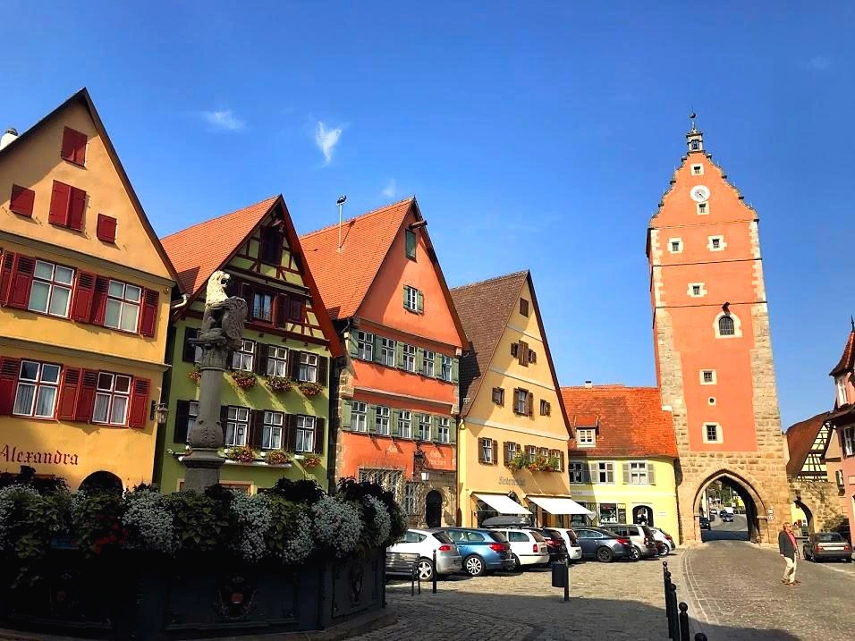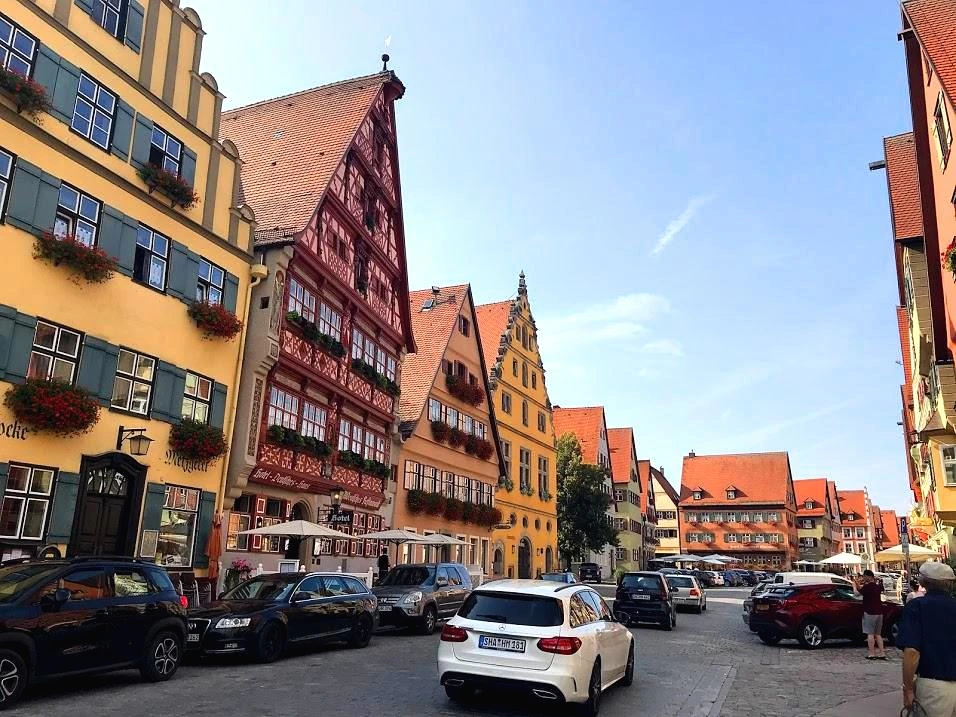 성문 안으로 들어간 딩켈스뷜의 길거리는 화려한 색의 경연이었다. 주황색 지붕들은 로텐부르크와 비슷했지만 각각의 건물들은 벽뿐만 아니라 창문의 덧문마저 저마다 노란색, 보라색, 연두색, 살구색 등 다양한 색으로 칠해져 있어 동화 속 풍경을 만들고 있었다. 파란 하늘 아래 파스텔 톤 집들은 더욱 선명하게 도드라졌다.